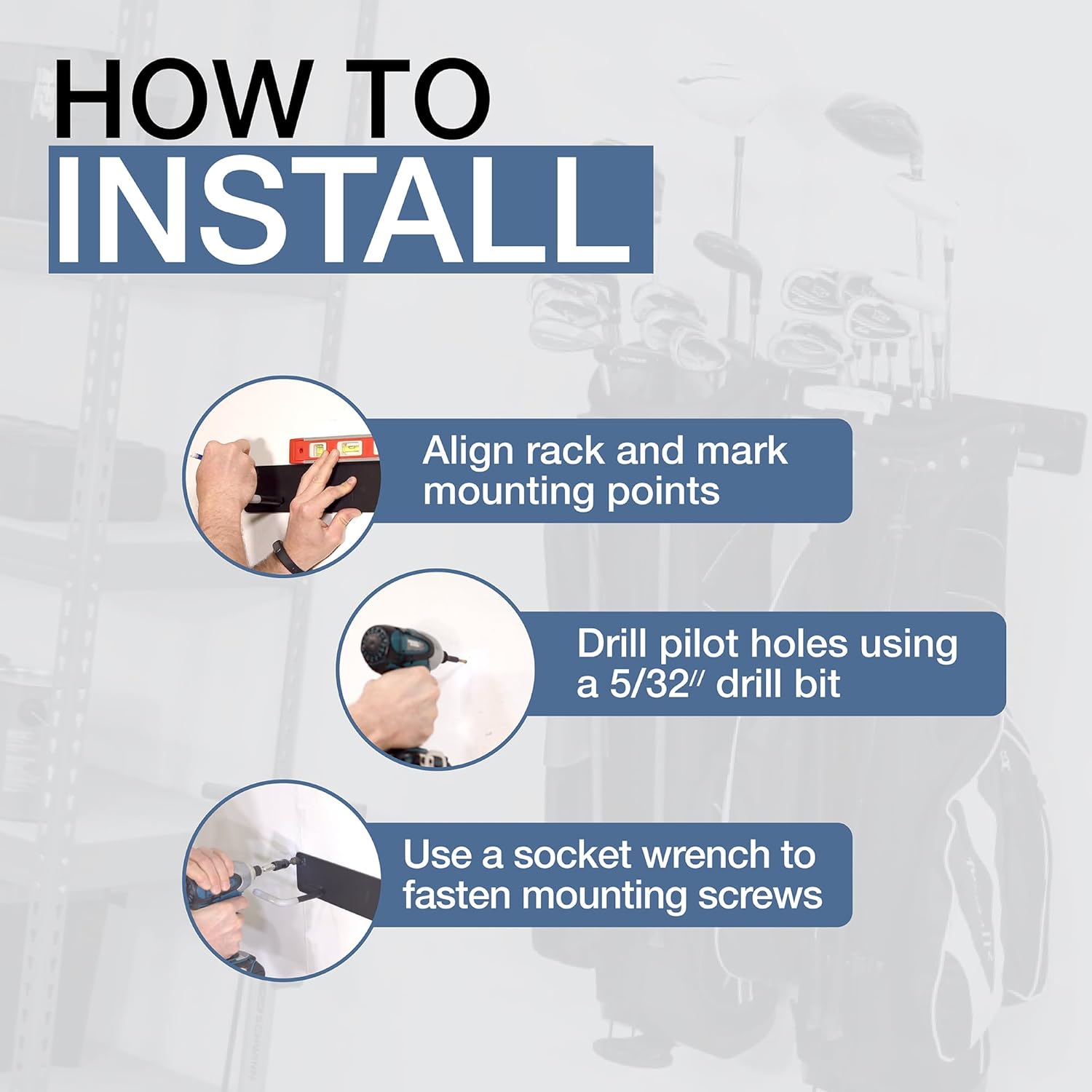 - Organized Wall Storage – This golf bag wall mount is the ultimate space-saving solution for organizing your golf gear in the garage, home, or shed while keeping your bags easily accessible.