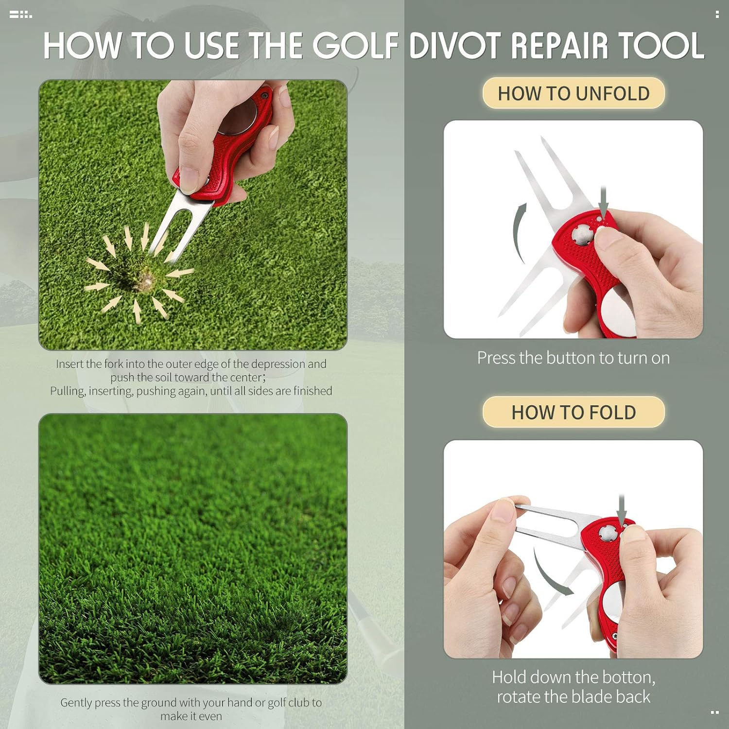 - Foldable and safe to use: the fork can be folded up with the popup button; You can press the spring button to easily open and close the divot repair tool; This considerate design can avoid the pointed fork scratching your pocket or hurting your fingers