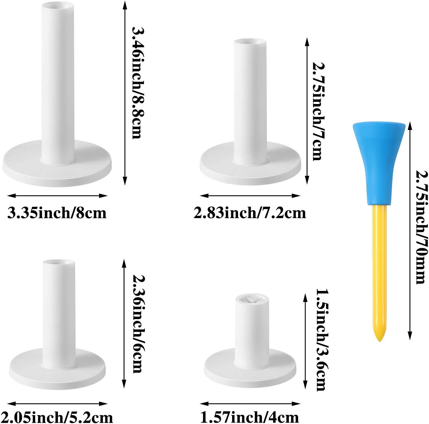 - Mix size: the golf rubber tees holders are packed in mixed size, including 3 x 1.5 inch/ 7.6 x 3.8 cm, 3 x 2.4 inch/ 7.6 x 6 cm, 3 x 2.75 inch/ 7.6 x 7 cm, 3 x 3.27 inch/ 7.6 x 8.3 cm and 4 x 2.75 inch/ 10.16 x 7 cm plastic tees; The different sizes will provide you with more choices