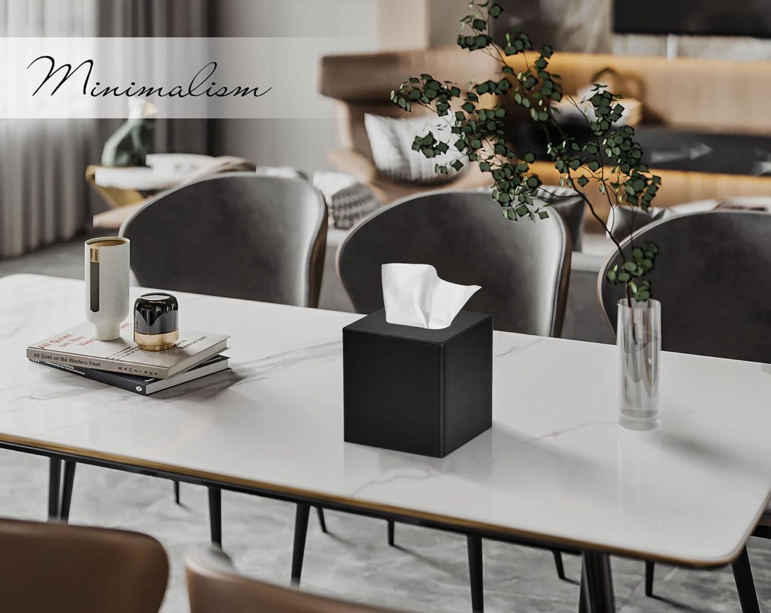 Tissue Box Cover Square PU Leather Facial Tissue Box Holder for Dresser Bathroom Decor (Black)