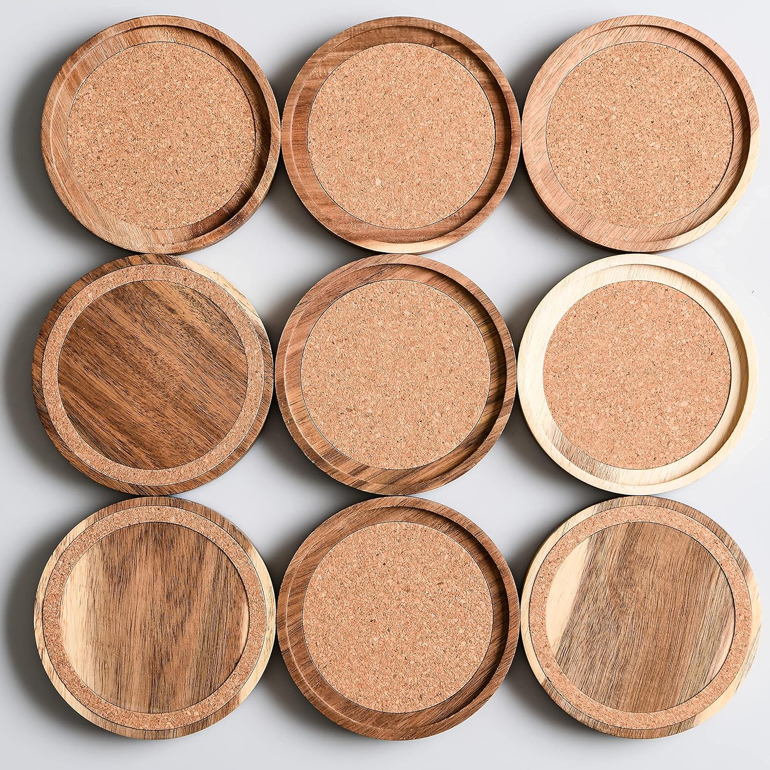 Acacia Wood Coasters for Drinks, 4.13 Inch, Set of 6, Absorbent and Insulation Cork Stackable Cup Holders, Rustic Coasters for Wooden Table, Designed by S1EGAN