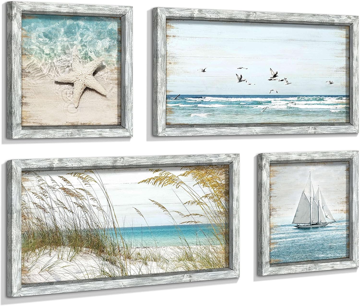 Beach Framed Wooden Pictures Wall Art: Coastal Art Set of 4 Seascape Prints Starfish Pictures Ocean Artwork for Bedroom Overall 36"W x 24"H