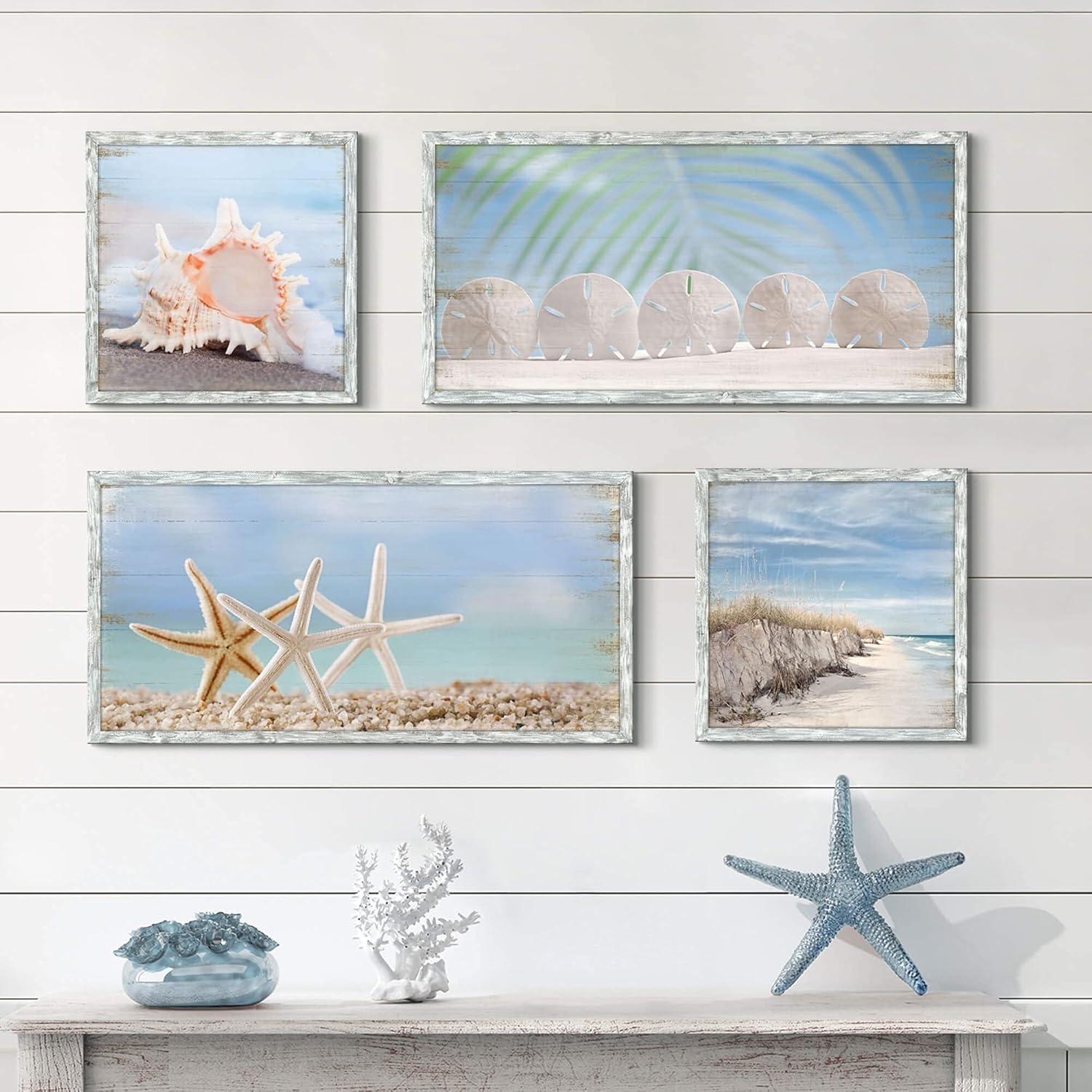Beach Prints Wooden Wall Art: Seashell Conch Starfish Pictures Collection Set of 4 Ocean Art Seaside Framed Wall Decor for Living Room Overall 48"W x 32"H