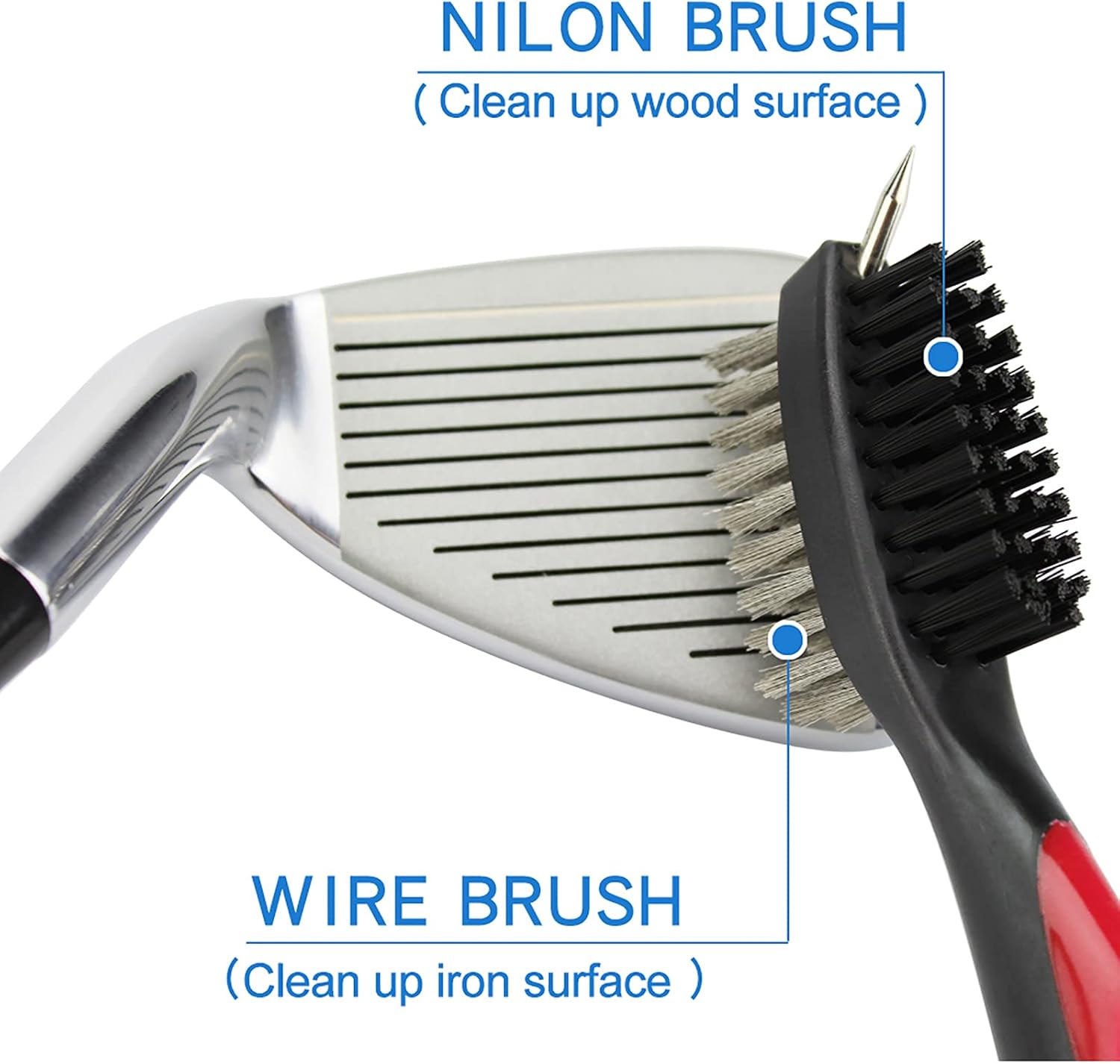 - 3-In-1 Golf Club Cleaner Brush - Golf club brush is a double-sided brush (soft nylon bristles and steel wire hard bristles) with sharp spikes, which is professionally used to clean your golf irons and wedges grooves, ensure better contact and optimum ball spin, also clean the grooves and the depths of golf shoes (Comes with plastic cover).