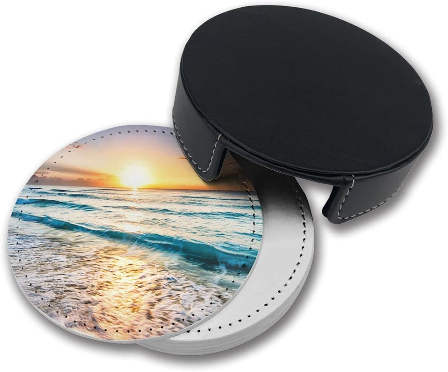 Ocean Theme Sand Beach Wave Sea Water Pattern Leather Drinks Coasters with Holder Set of 6, Suitable for Kinds of Cups