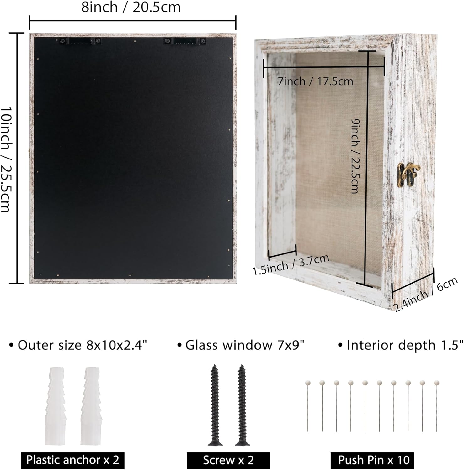 - Frame Size - The outer size of this shadow box is 8x10x2.4" and the glass window size is 7x9". Do not fit 8x10 pictures. Please note the interior depth is 1.5 inches. Thickness larger than 1.5" cannot be placed into this shadow box.