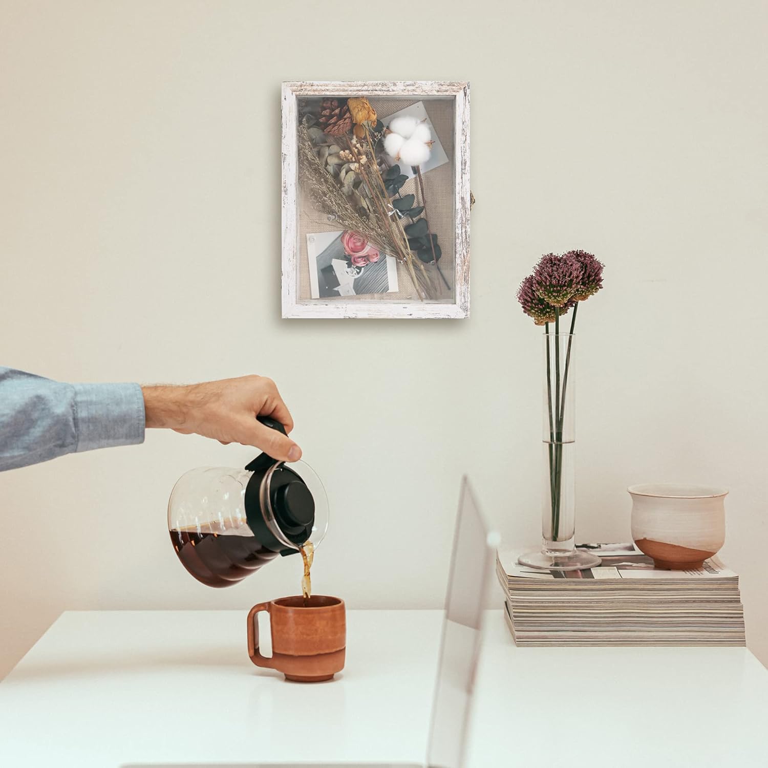 GraduatePro Shadow Box Frame 8x10 Display Case with Linen Back, Real Glass Window Door with Hinge, Picture Frame Wedding Bouquet Memorabilia Medals Photos Memory Box for Keepsakes, Rustic White