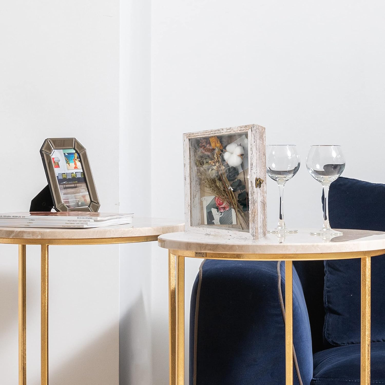 - Hinged Door - The front display door makes it easy to place or exchange items inside. The retro horn lock makes the shadow box lockable and more secure, and prevents the items inside from falling out.
