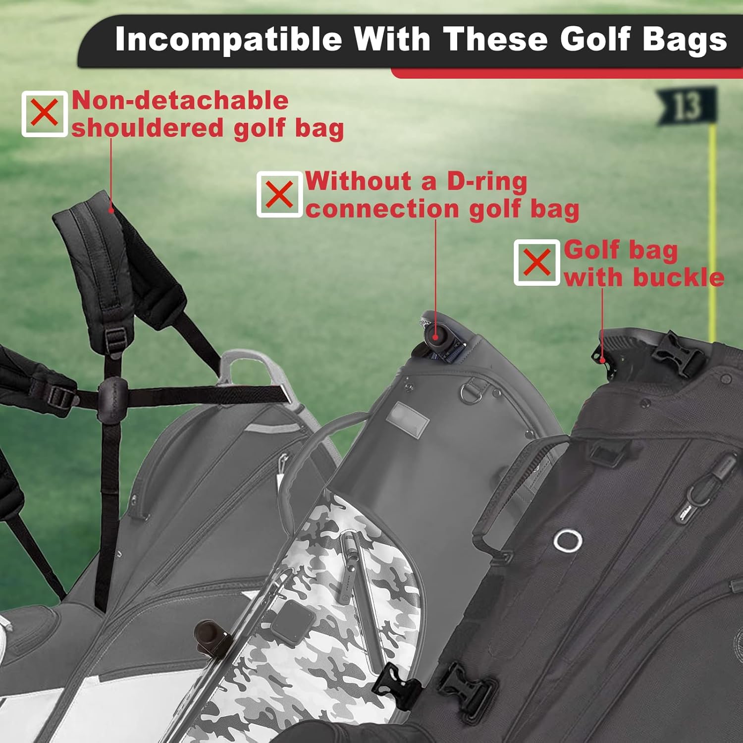 - They only work on golf backpack-style staff bags with 2 D-rings and 4 D-rings. Please check if your bag has ample hooks or circles for the buckles before ordering