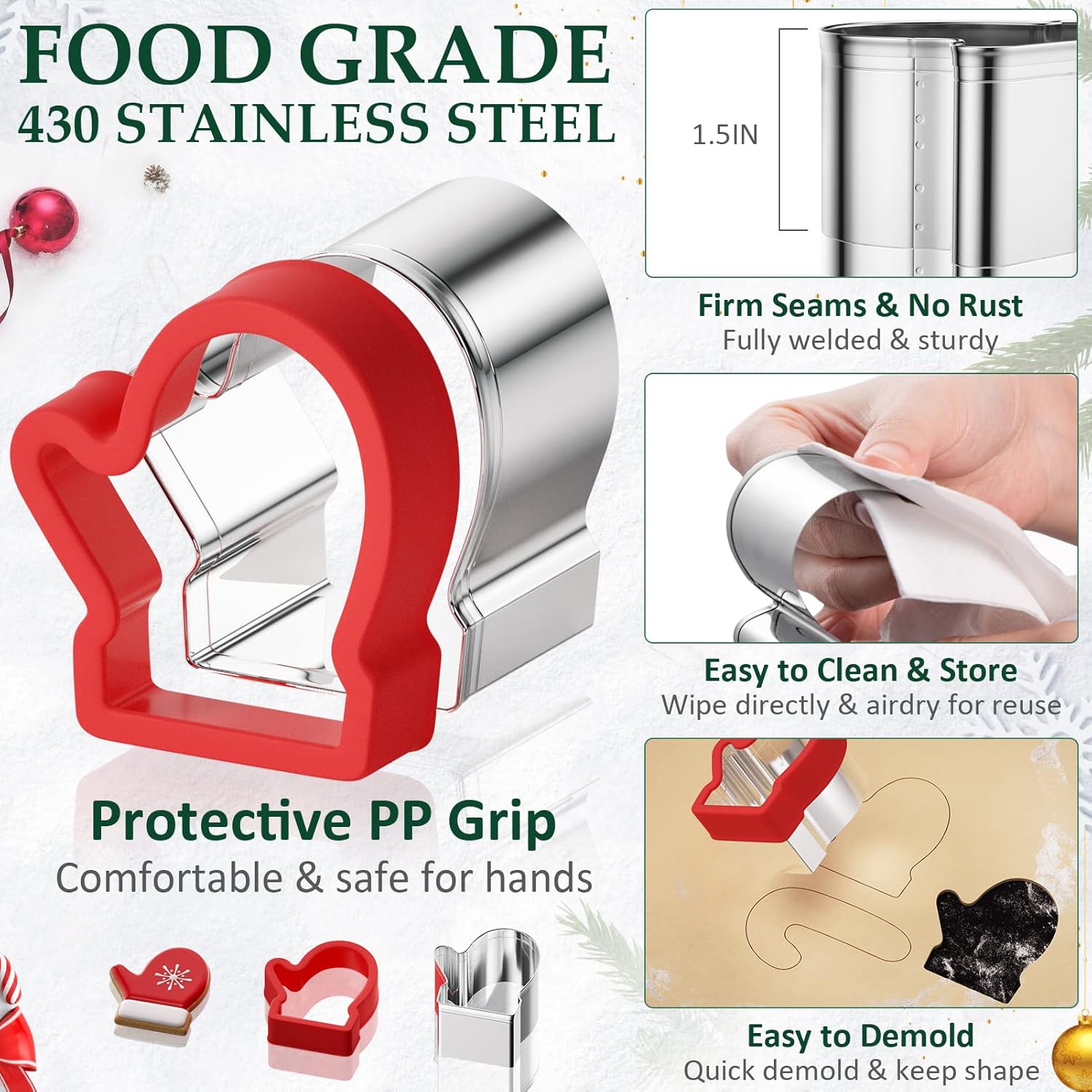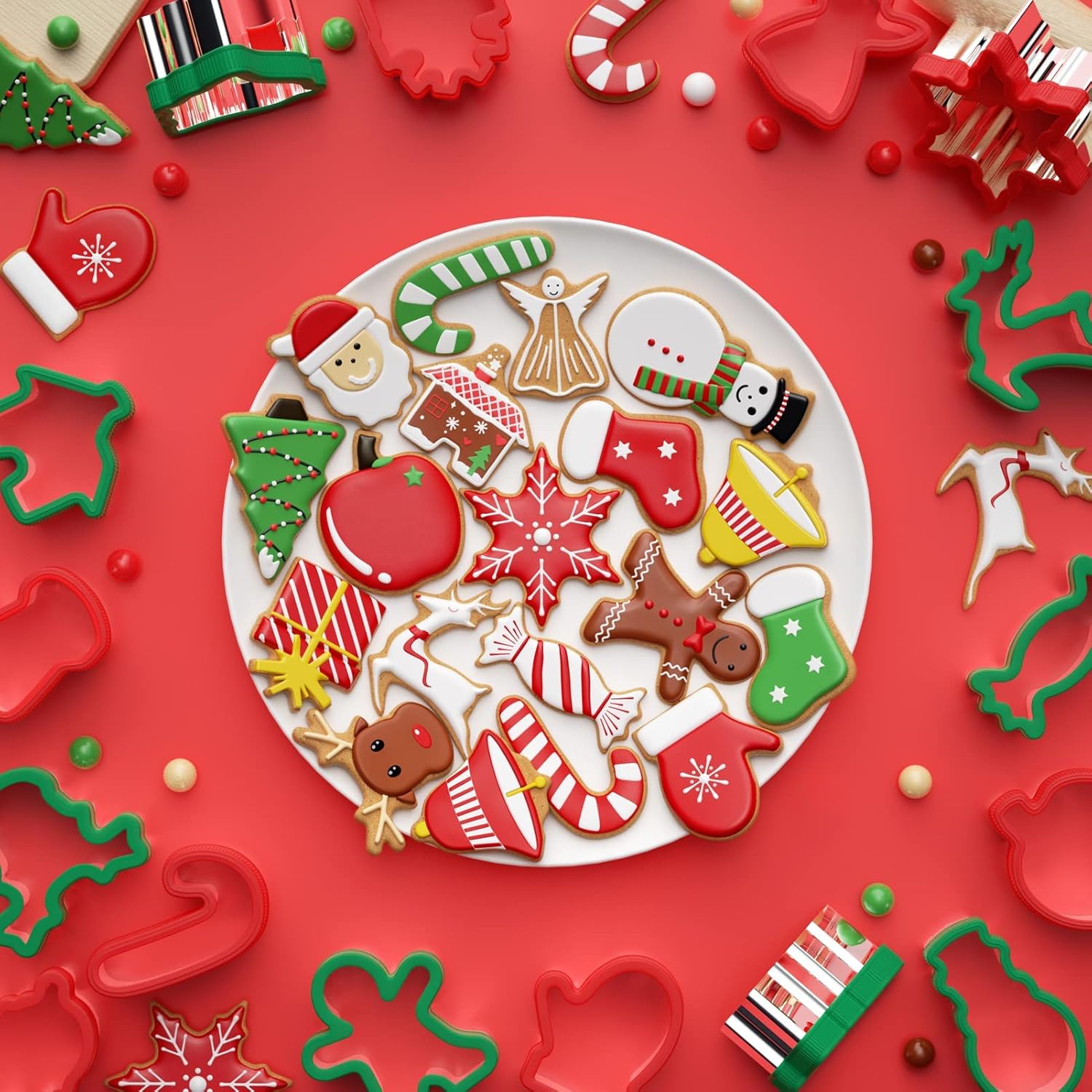 - CHRISTMAS COOKIE CUTTER SET: Package includes 16 different classic Christmas Cookie Cutter Shapes: Snowflake, Snowman, Gingerbread, Santa Claus, Christmas Tree, Candy Cane, Reindeer, Glove, Gingerbread House, Candy, Angel, Apple, Gift, Bell, Sock, Reindeer Head. Various cute shapes meets your various baking, cooking or cutting needs, especially great for cookie making for Christmas, Thanksgiving, Winter, Holiday Party Favors, New Year, Event, Picnic, Family Party, etc.