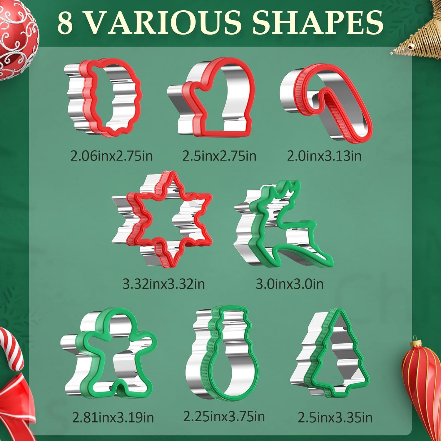 - CHRISTMAS COOKIE CUTTER SET: Package includes 8 different classic Christmas Cookie Cutter Shapes: Snowflake, Snowman, Gingerbread, Santa Claus, Christmas Tree, Candy Cane, Reindeer, Glove. Various cute shapes meets your various baking, cooking or cutting needs, especially great for cookie making for Christmas, Thanksgiving, Winter, Holiday Party Favors, New Year, Event, Picnic, Family Party, etc.
