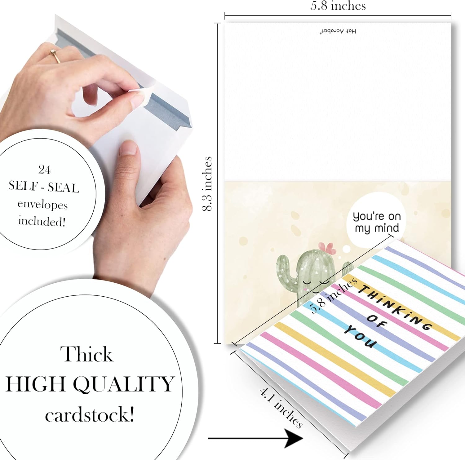 - 24 encouraging cards: With 24 thinking of you cards with envelopes, housing 4” x 6” photos, you’ll have more than enough heartfelt greeting cards of encouragement and funny thinking of you cards to send to those you wish to inspire.