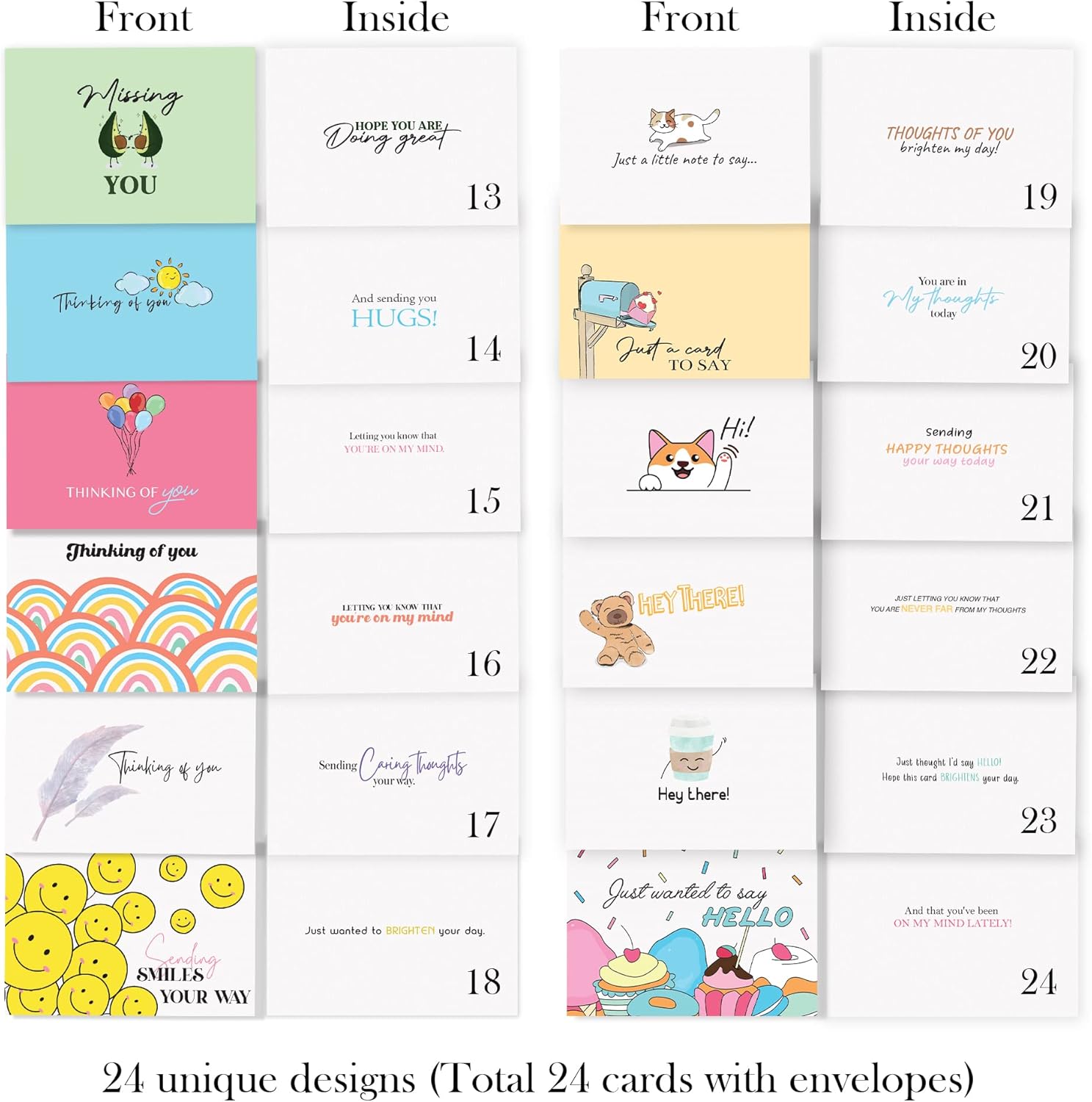 - 24 unique designs: Your greeting cards assortment of encouragement cards for kids and adults includes 1 card each of 24 heartwarming designs so your recipient will know their thinking of you card was carefully picked.
