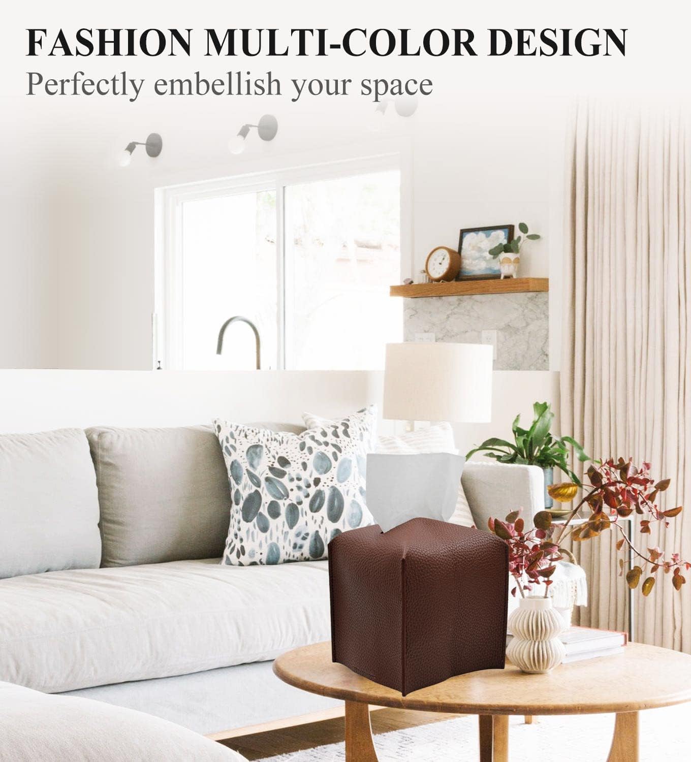 - WHAT YOU GET: High quality PU leather tissue box cover, with our 18-month worry-free and friendly customer service. It's a good gift for home, office, and car. Perfect for most tables, night stands, desktops, countertops in kitchen, vanities and desks, living room in your daily life. It is a great gift idea for housewarming, house decoration, etc.