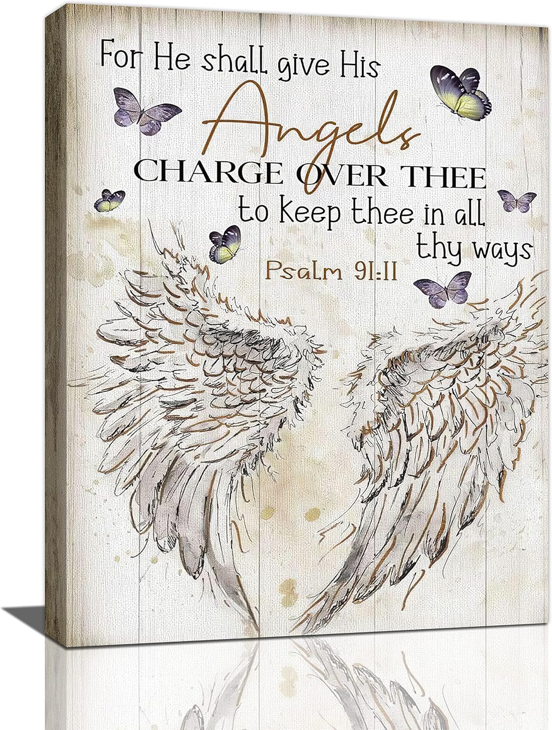 Scripture Psalm 91 Wall Art Christian Angel Wings Pictures Wall Decor Bible Verse Canvas Painting Print Artwork Abstract Modern Home Decorations Framed Ready to Hang for Office Living Room 12"x16"