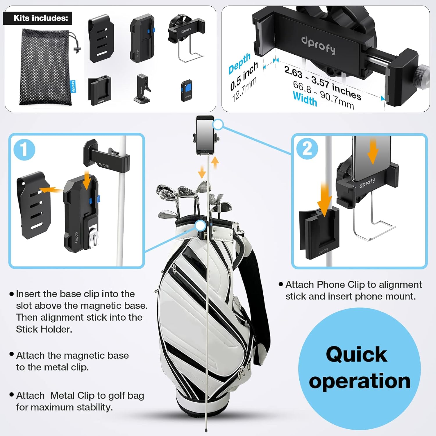 - ăEasy to InstallăDprofy golf phone caddy built-in N52 with super STRONG magnets which very easy to install and use, enough magnetic to help the phone mount stay on golf cart stable without falling even in steep hills. Our golf cart mount come with golf bag metal clip,easy use on golf club bag,golf stand bag and golf cart,especially perfect for the golf cart with windshield frame