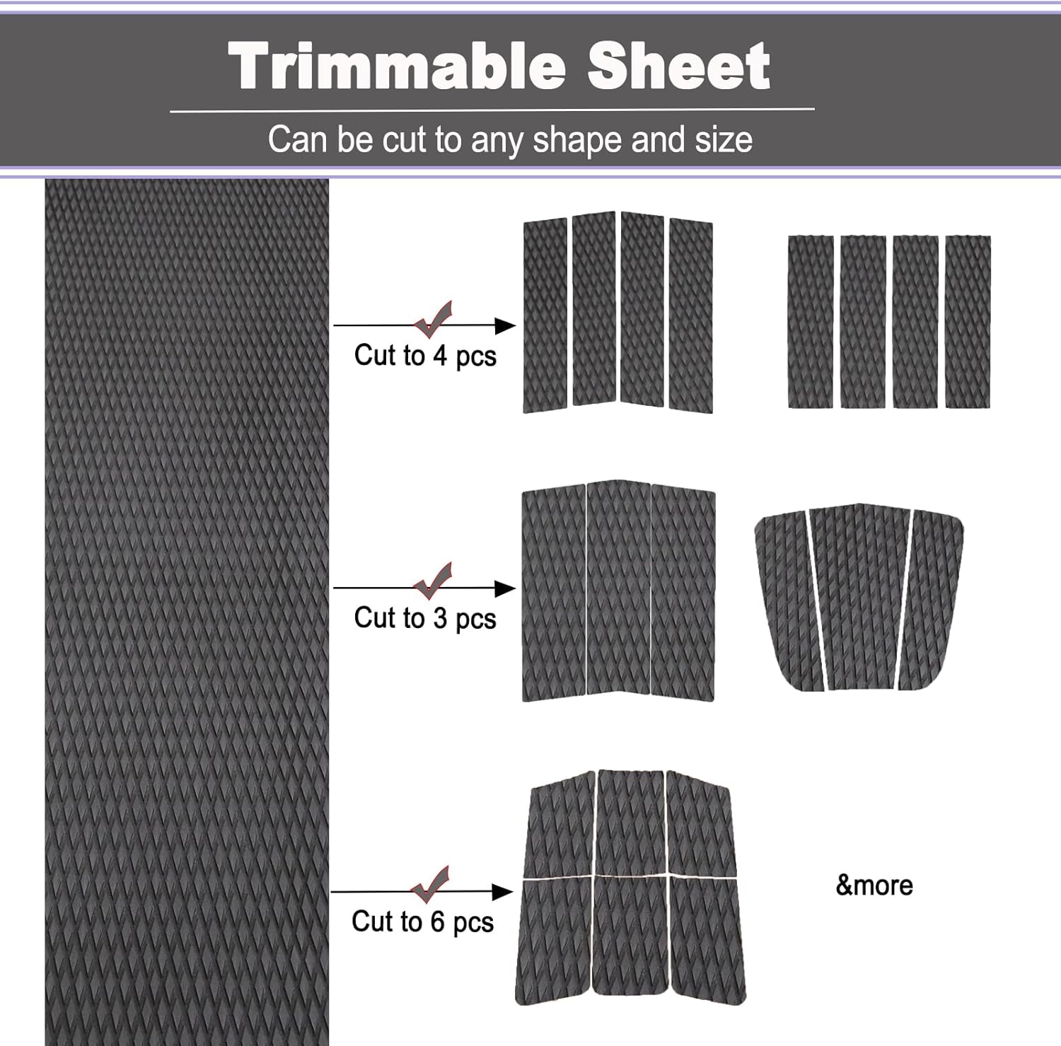 - Trimmable EVA Pad - EVA foam boat decking sheet, can be trimmable, you can DIY to any size/shape to fit your surfboard and decking. Also have 6 kinds of color you can choose, making your surfboard special and charming. DIY SURFING TRACTION PAD