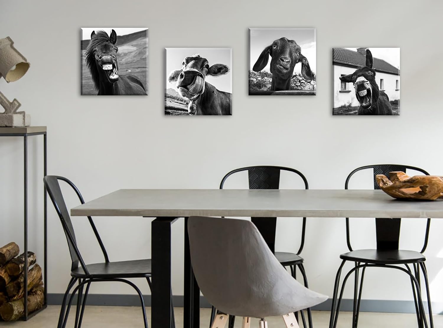 Black and White Wall Art Animal Wall Decor Horse Donkey Sheep Cow Canvas Pictures Prints Funny Decor Posters for Mens Bedroom Office Farmhouse Decoration Stretched Framed Ready to Hang 12×12 inch×4