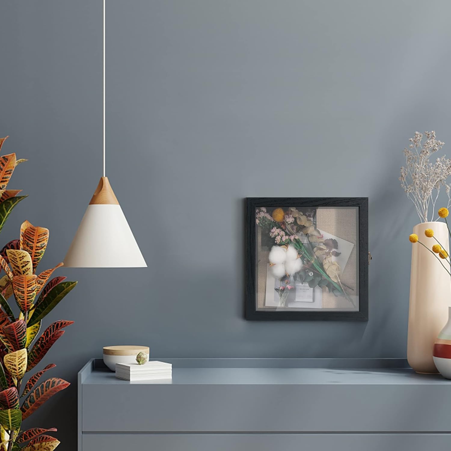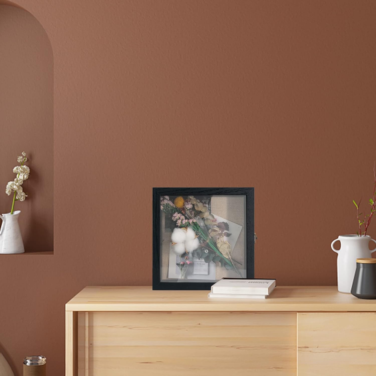 GraduatePro Shadow Box Frame 8x8 Display Case with Linen Back, Real Glass Window Door with Hinge, Picture Frame Wedding Bouquet Memorabilia Medals Photos Memory Box for Keepsakes, Rustic Black