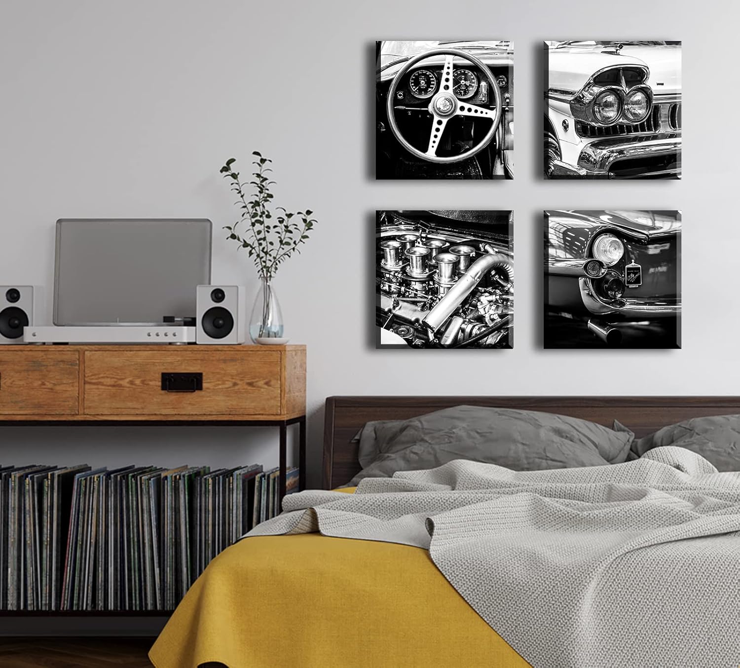 DJSYLIFE Black and White Wall Art Vintage Car Posters Decor Mens Bedroom Boys Room Office Paintings Canvas Pictures Framed Ready to Hang 12" W×12" H×4 PCS