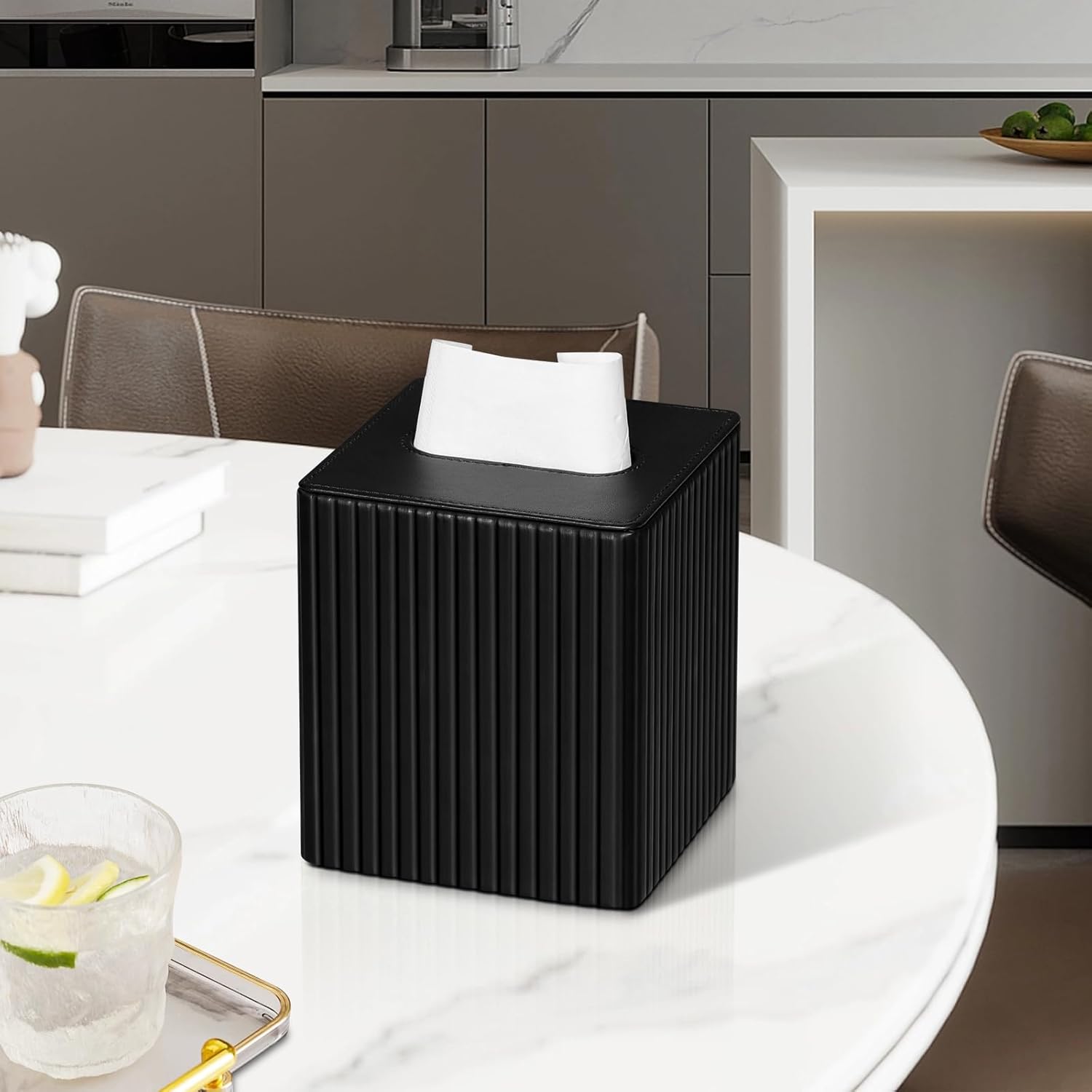 PU Leather Tissue Box Cover Square Tissue Box Holder with Magnetic Closure (Black Stripe)
