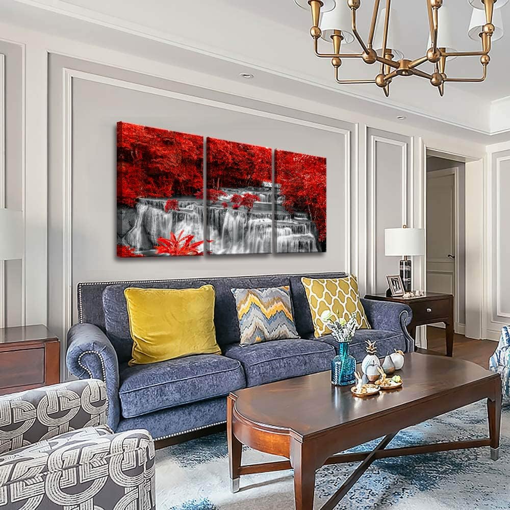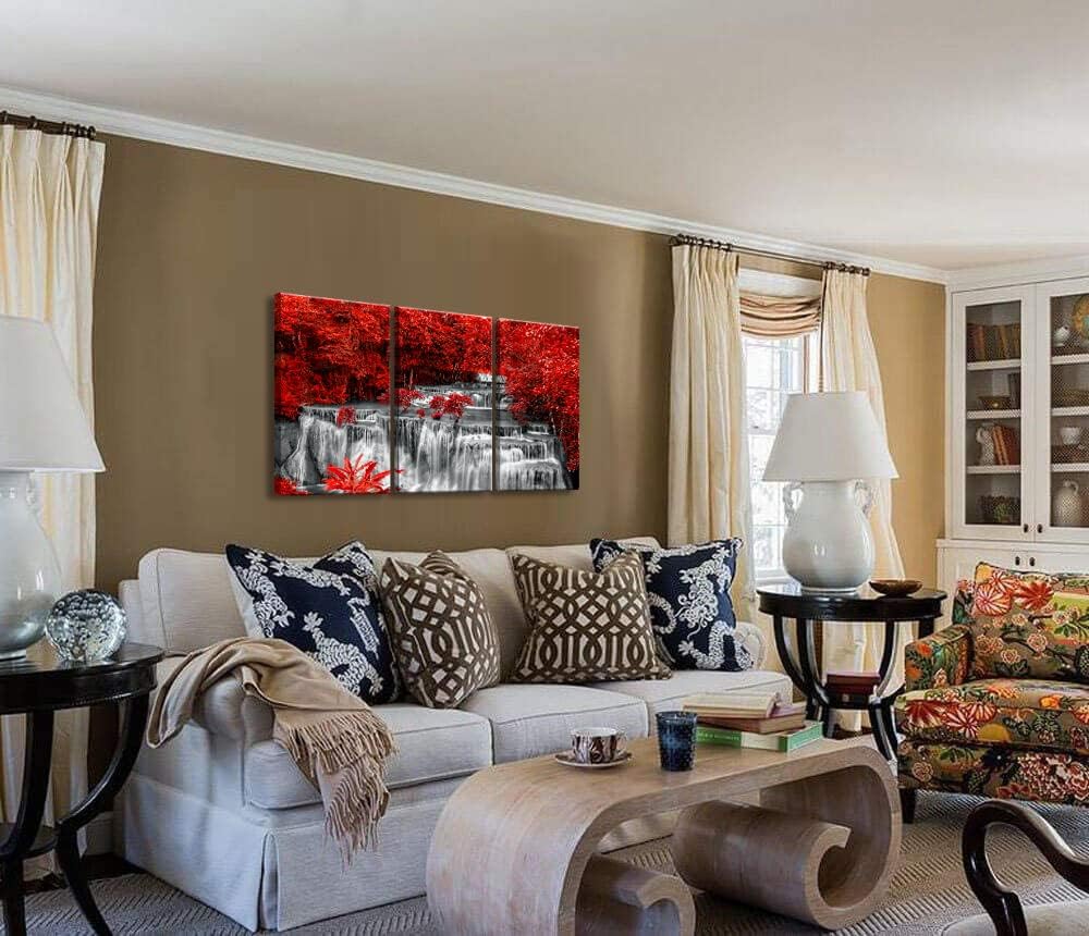- 🍂Perfect Black White Red Landscape Wall painting:The high-quality canvas is printed with multi-level waterfall scenery, which makes you feel that you are looking at the beautiful landscape every day and the red woods decorate the whole room.