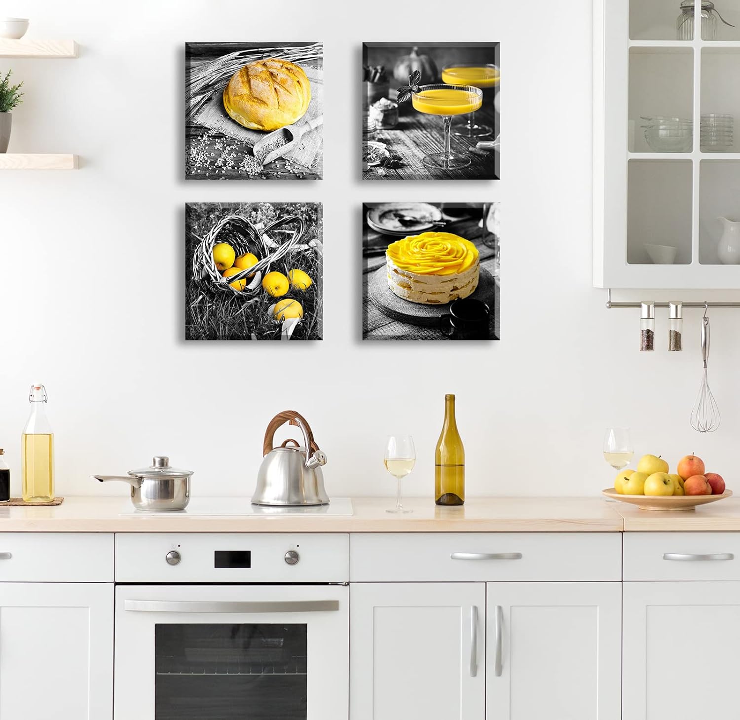 - Kitchen Decor:kitchen wall decor,kitchen wall art,yellow kitchen decor,kitchen accessories,farmhouse wall art,the black and white yellow food picture very suitable for black, white, gray, yellow, blue, gold, brown, pink, light green wall decoration accessories.adds nice color to the room,makes your room look more beautiful and injects the soul of modern decoration.