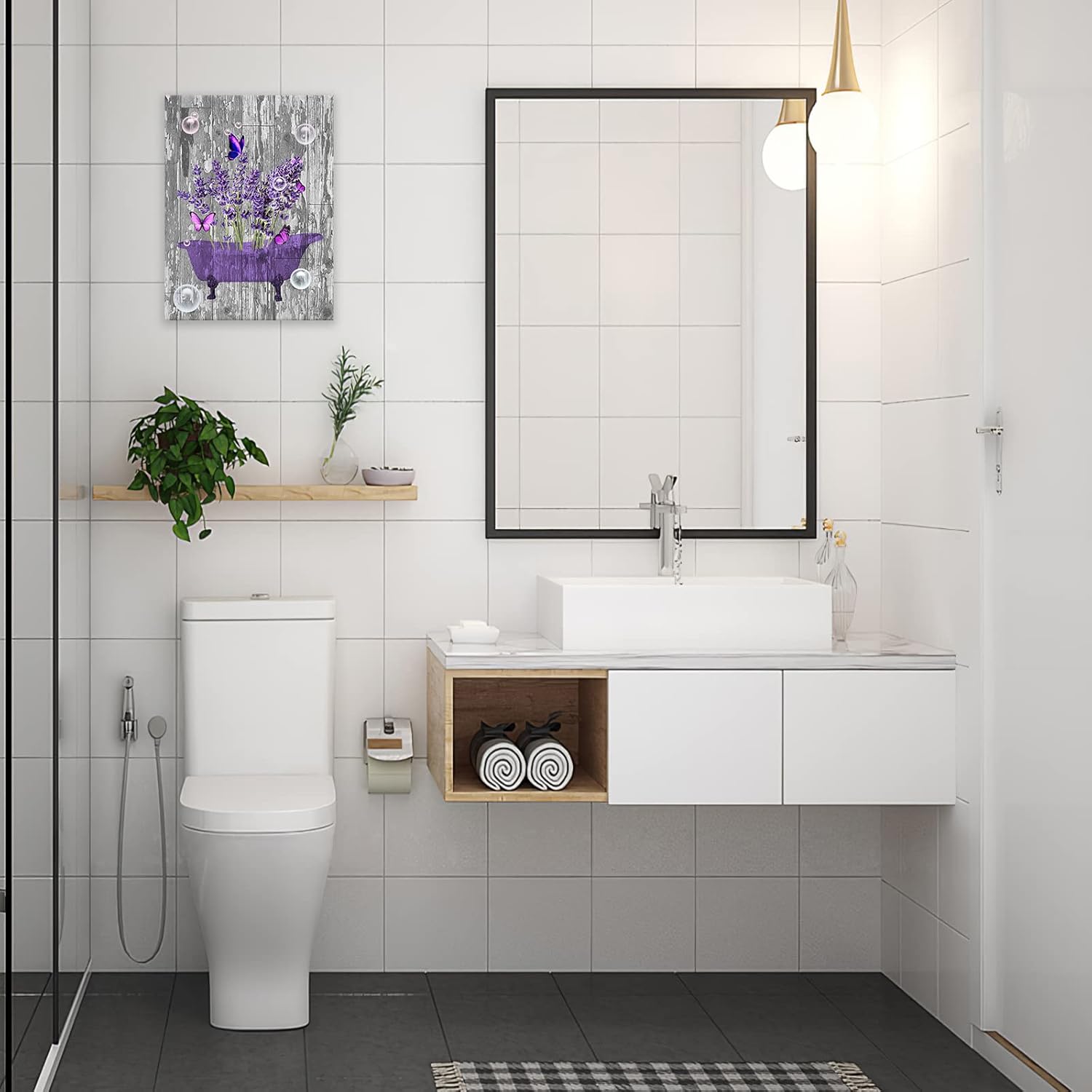 Lavender Bathroom Decor Wall Art Purple Farmhouse Bathroom Pictures for Wall Rustic Butterfly Bathtub Artwork Vintage Country Bathroom Grey White Painting Framed Bath Laundry Decorations 16"x24"