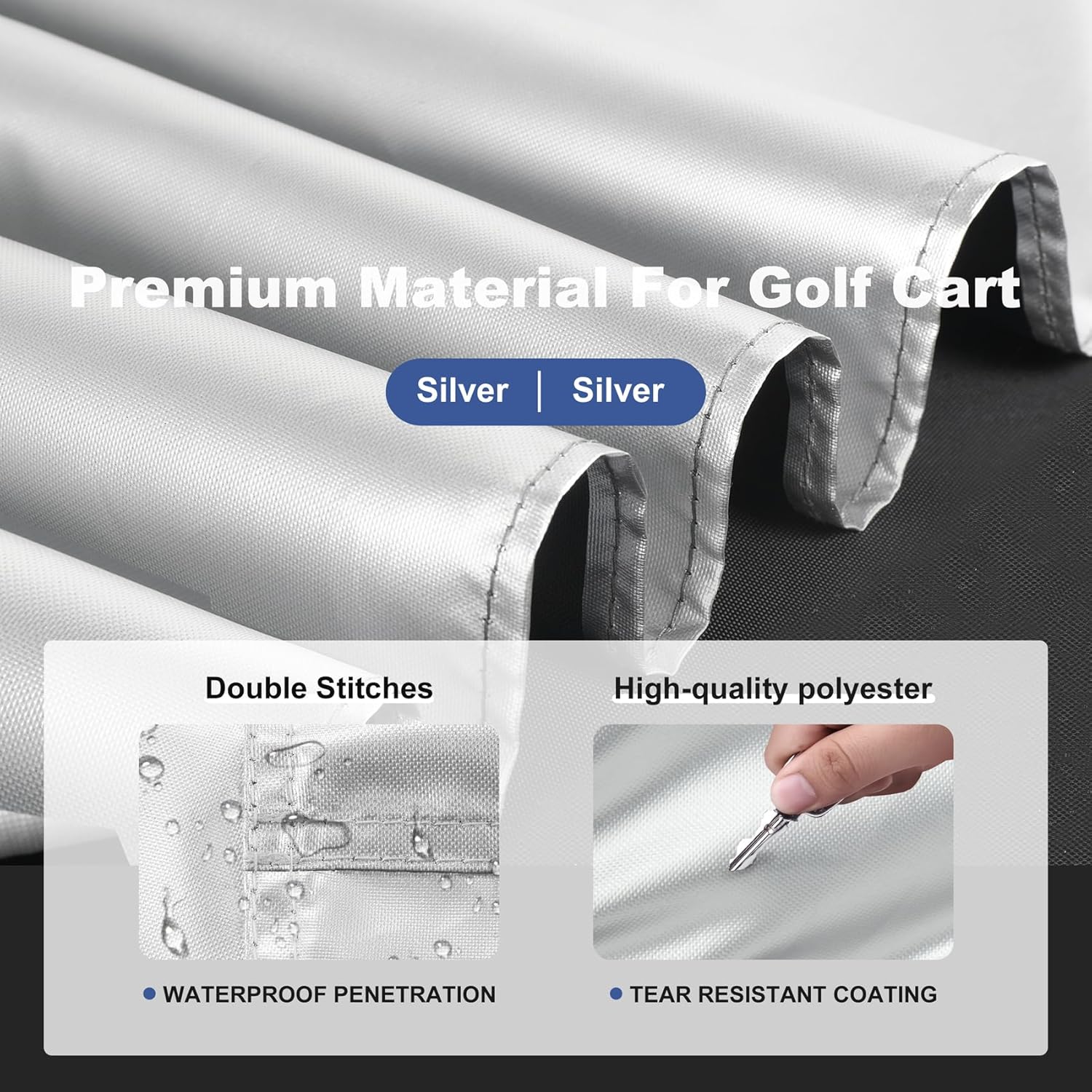 - 【Waterproof and UV Resistant】Premium aluminum with waterproof coating backing, efficient light blocking and night reflection, waterproof double stitching, protect your golf cart from rain, UV, sand, snow, dust, fog, scratches and other severe weather effects