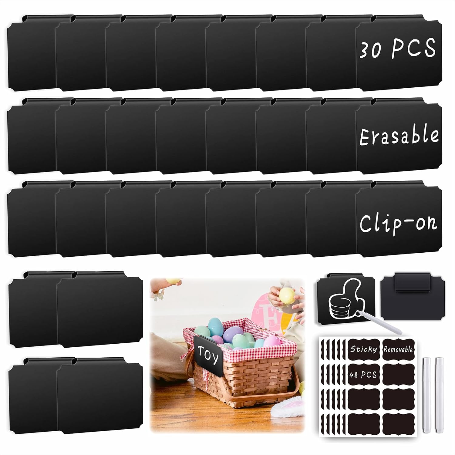 - 【Good-value 81-Piece Organization Kit With Practical Bonuses】- The package comes with plastic basket clip-on labels 30 pcs, white chalk marker 3 pcs and PVC adhesive sticker labels 48 pcs (extra practical bonuses). We're very concerned with your messing problems at home and office. Let's get it solved easily: make this economical purchase and get everthing organized back and create a more functional storage system. This organizing set can meet your daily use and replacement completely.