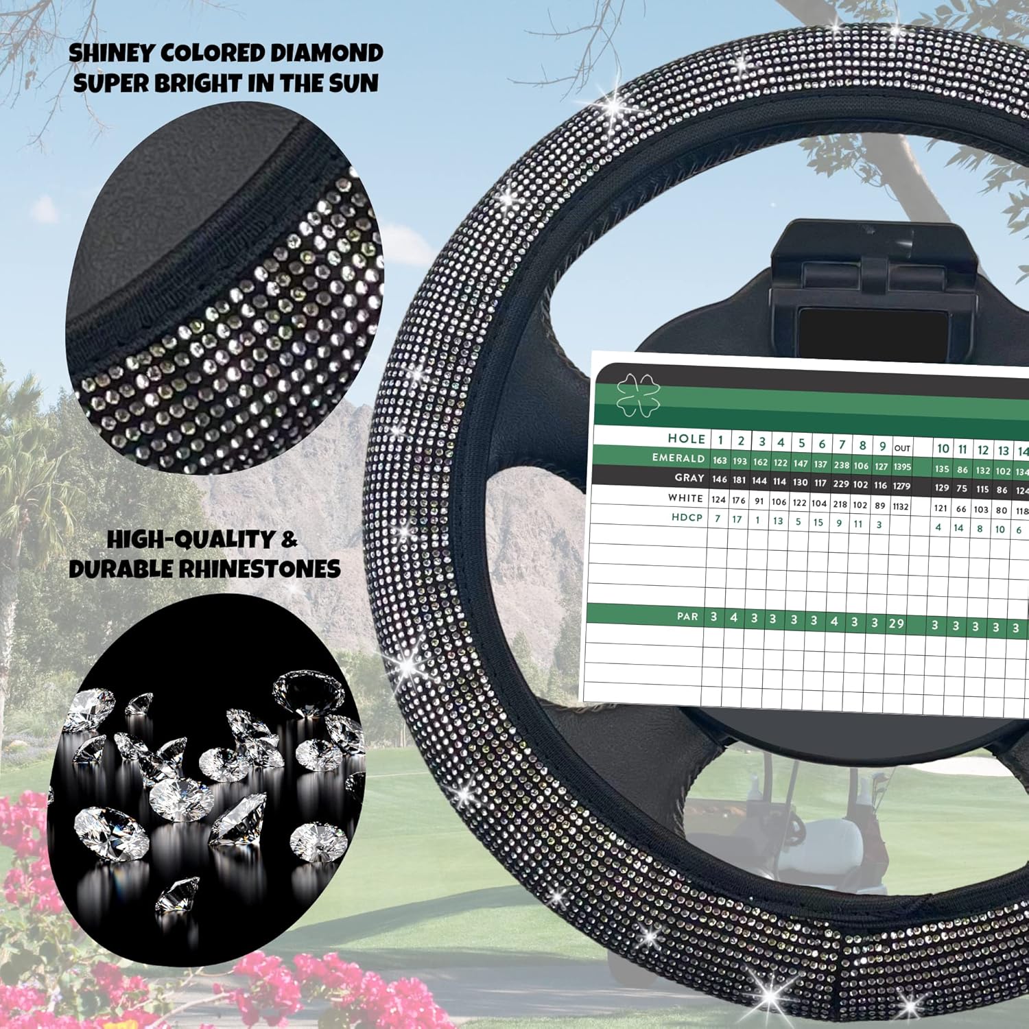 - š CUTE GOLF CART ACCESSORIES: Our fashionable Colorful Design Steering Wheel Covers are decorated with hundreds of shiny rhinestones that add luxury to any golf cart: sparkling through the windshield and shining your car. Perfect Gift for any female who enjoys sparkling bag towels, colorful pink golf balls, rhinestone visor, crystal visor headwear, bling shoe, Swarovski crystal golf ball markers, fashionable golf shirts, and of course a glass of wine.