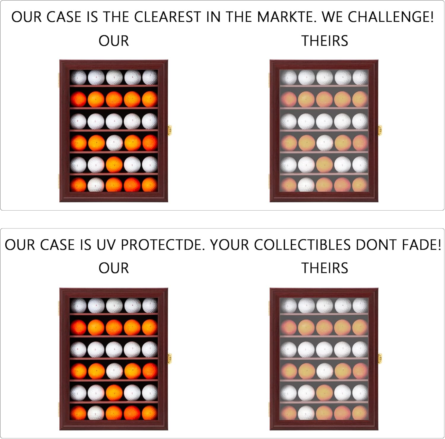 - 【MUST HAVE FOR A GOLFER】 - WOODEN 30 GOLF BALL CASE with a outer size 14"H X 10.6"W X 3"D. Golf ball holder has the lockable glass door with gold plated anti-theft locks to prevent dust and add safety. This cabinet can display 30 pcs golf balls.Note:Golf Balls Not Included.