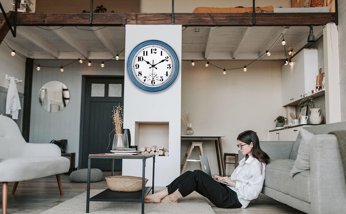 JENLYSTIME 12 Inch Indoor/Outdoor Retro Waterproof Wall Clock with Thermometer Silent Round Quartz Battery Operated Easy to Read Decorative for Kitchen Patio,Bathroom,Deck,Porch,Pool(Blue)