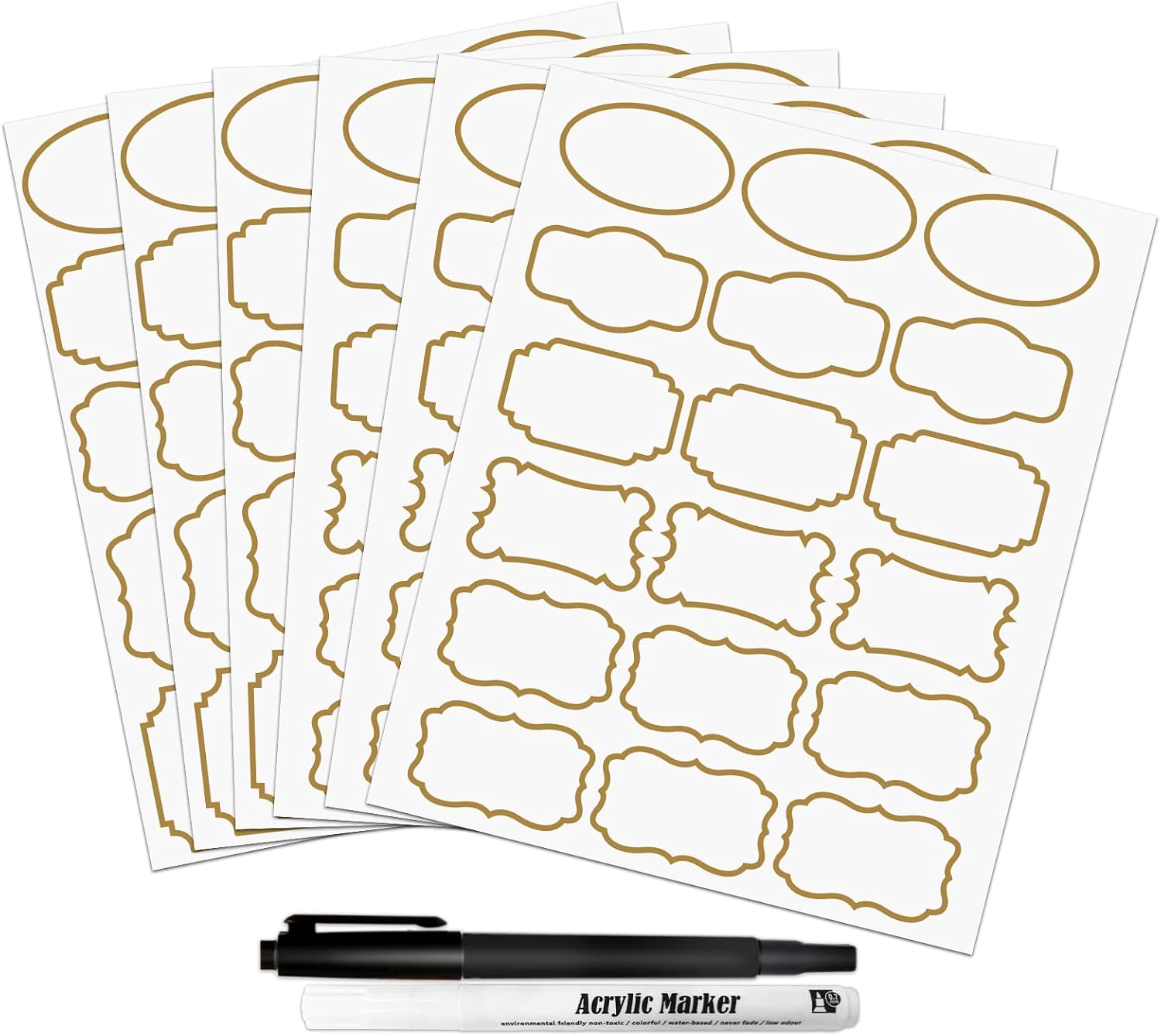 Kitchen Pantry Food Containers Clear Labels with Gold Border, 93 Waterproof Removable Write-on Sticker Labels Tags to Organize Spice Jars Condiment Flour Sugar Canisters Storage Bins, Free 2 Markers