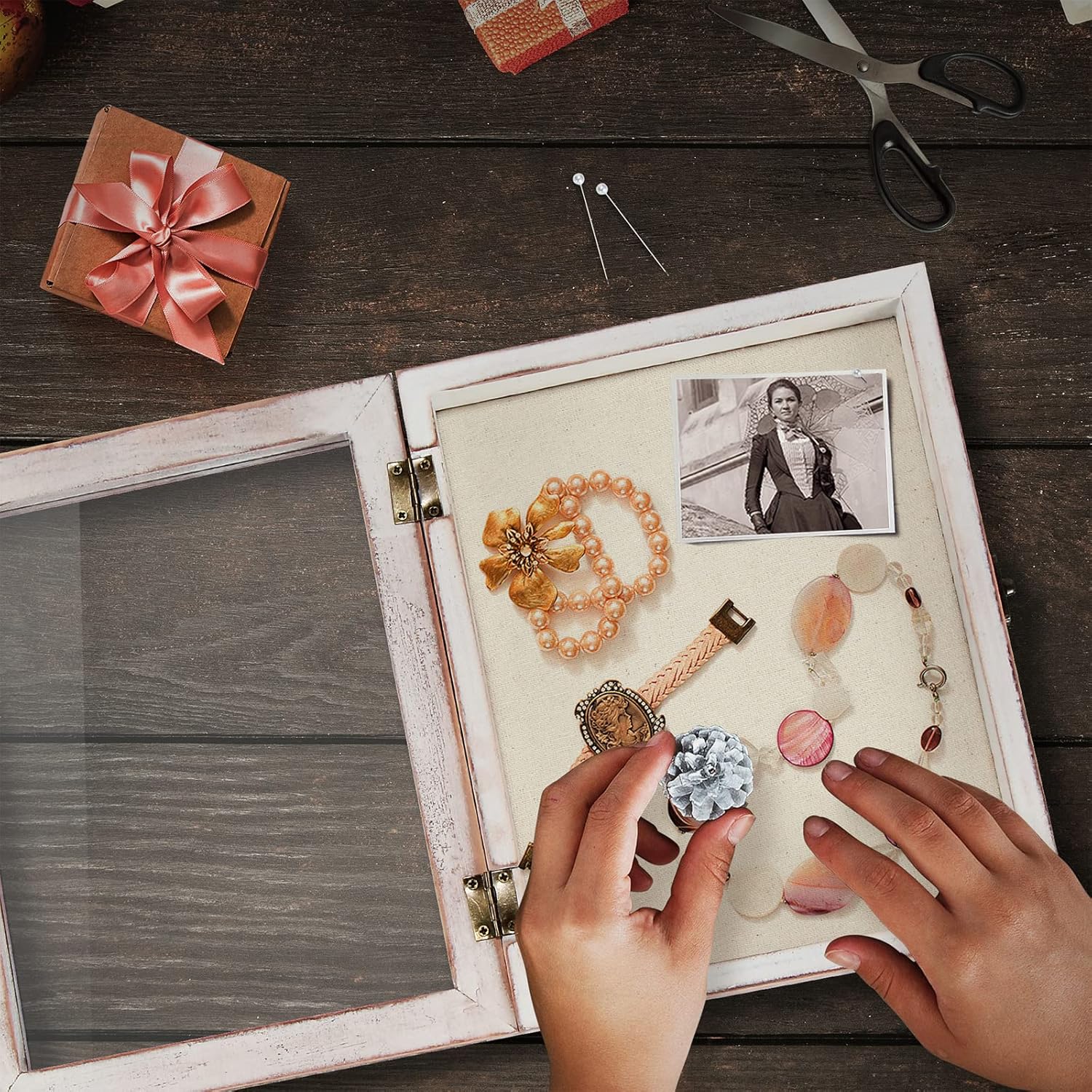 - High-Quality Materials – The shadow box inside dimension is 7.1'' x 9.1'' x 1.43'' (depth) and the outside is 8” x 10”, comes with a solid, durable wood frame, woven fabric interior with 4 stick pins, hasp horn lock door with a transparent shatterproof glass window, and two metal sawtooth hanging hooks on its back.