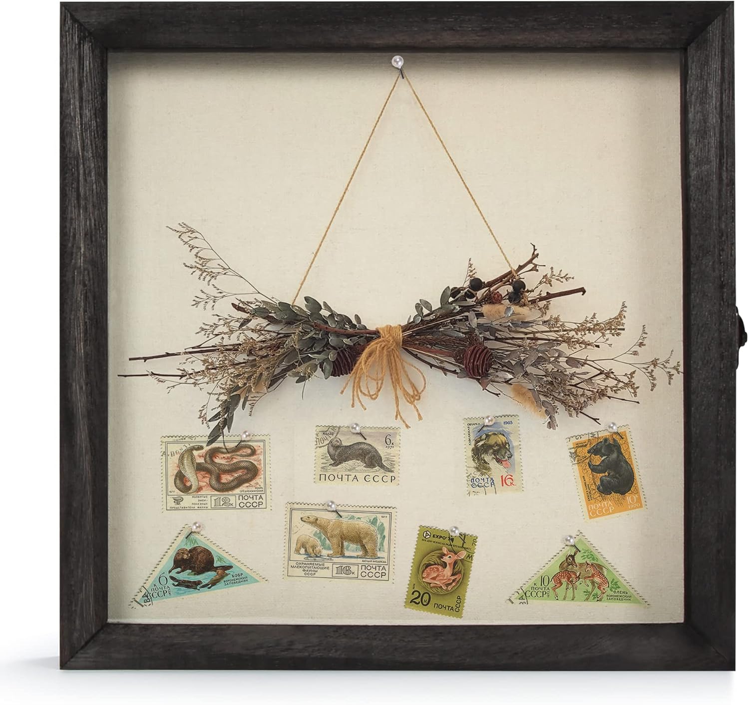 - High-Quality Materials – The shadow box inside dimension is 9.4'' x 9.4'' x 1.6'' (depth) and the outside is 11” x 11”, comes with a solid, durable wood frame, woven fabric interior with 12 stick pins, hasp horn lock door with a transparent shatterproof glass window, and two metal sawtooth hanging hooks on its back.