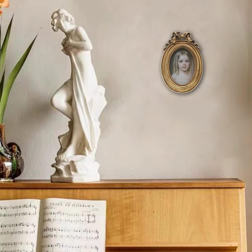 - ATTRACTIVE LOOK: The beautiful tiny frame is hand crafted in gorgeous bronze gold color. It looks warm and appealing. Special vintage oval appearance with perfect details. Outline border dimensions are 3.8x5.6 inch and made to display a 2.5x3.5 inch oval photo. It will light your home and make your room look more like a work of art.