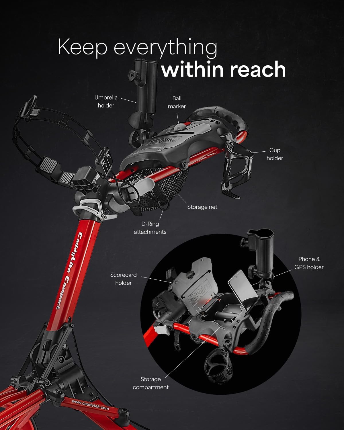 Caddytek CaddyLite Compact Golf Push Cart - Lightweight Aluminum 3-Wheel Foldable Golf Bag Cart with Quad-Fold System, EVA Wheels, Adjustable Handle, Brake, Mesh Net, Umbrella & Drink Holder
