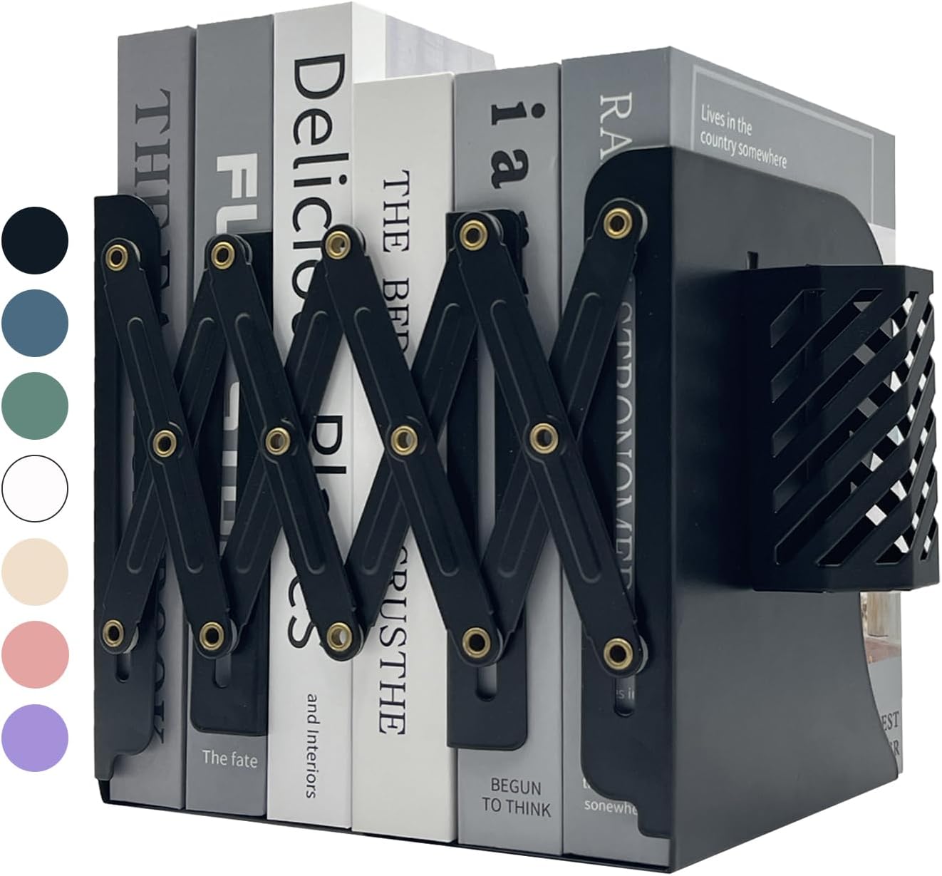 Kingsmile Book Ends, Adjustable Bookends for Shelves, Metal Bookends for Heavy Books, Book Stopper Organzier with Pen Holder for Desk, Kids Room, Office, Classroom, Library, Study Room.(Black)