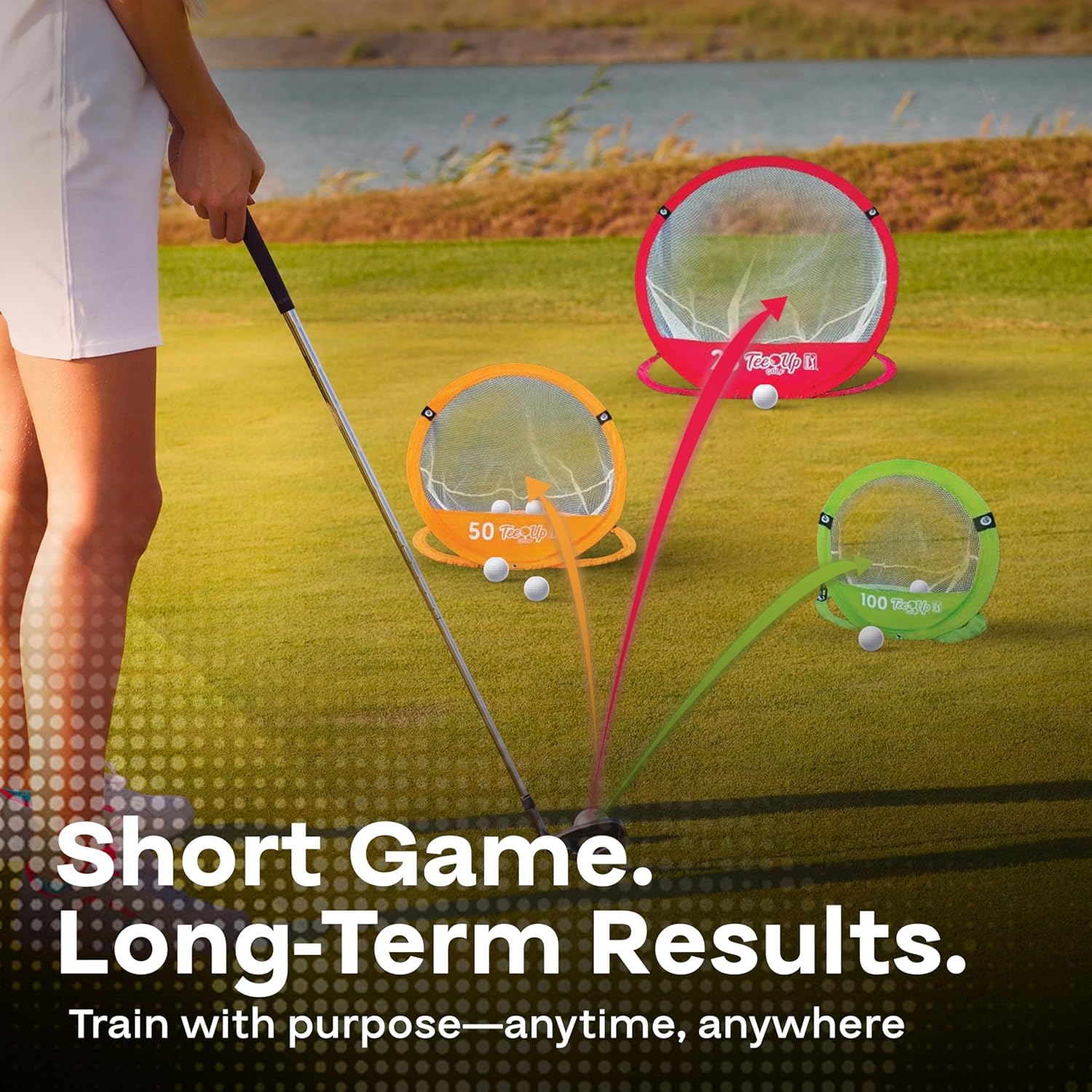 - MULTI TARGET SHORT GAME TRAINING Sharpen accuracy with 3 pop-up chipping nets in progressive sizes (24”, 18”, 12”)—designed for skill-building drills and game-like precision practice for all players.