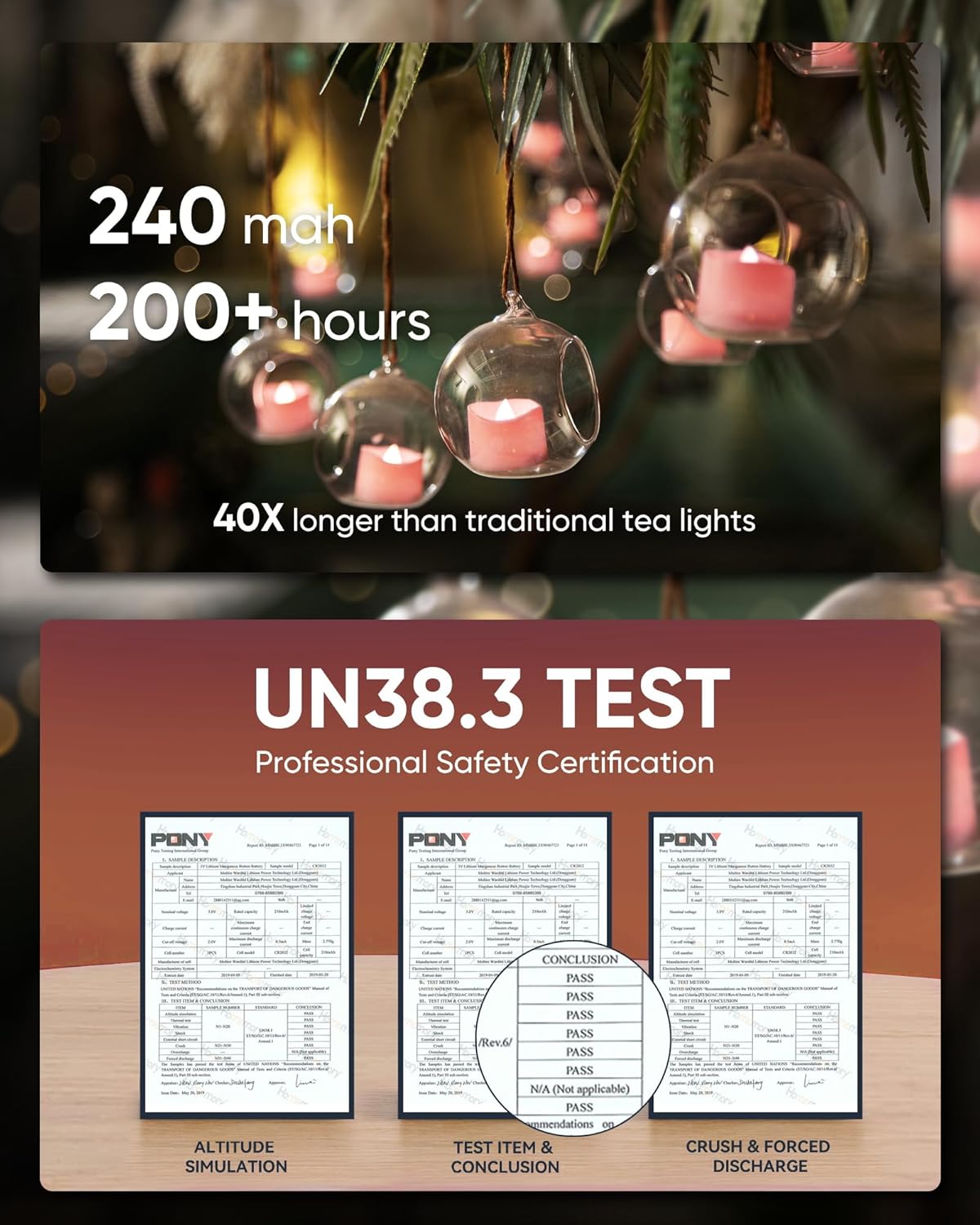 - RELIABLE & SECURE: Homemory LED tea lights are tested rigorously, ensuring their reliability. With (UN38.8) internationally certified batteries and healthy polypropylene materials, plus a secure battery cap design, we care about your safety