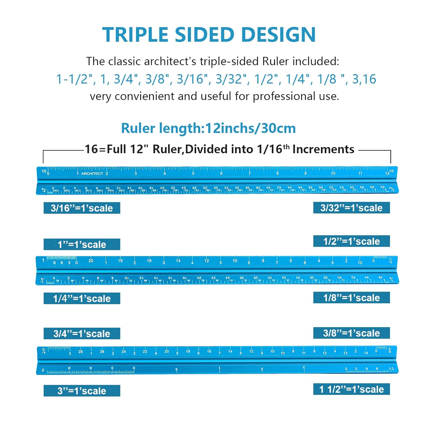 - [TRIPLE SIDED DESIGN] The classic architect ruler included: 1-1/2", 1, 3/4", 3/8", 3/16", 3/32", 1/2", 1/4", 1/8", 3, 16, very convenient and useful for professional use and the architect engineer ruler also perfect for your needs