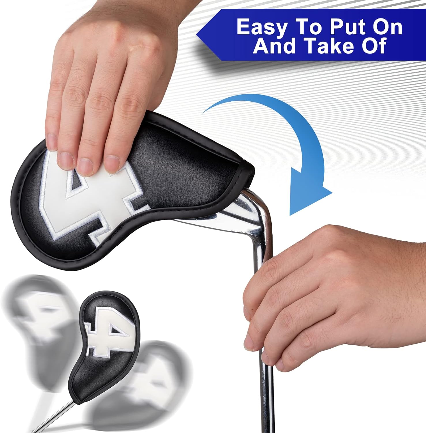 - Package Included : 1 set 10pcs ( 4,5,6,7,8,9,P,A,S,X ) black iron headcovers with large white No.
