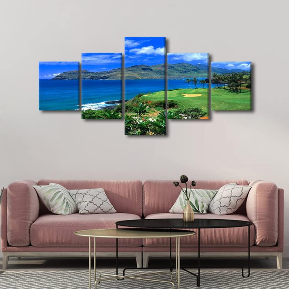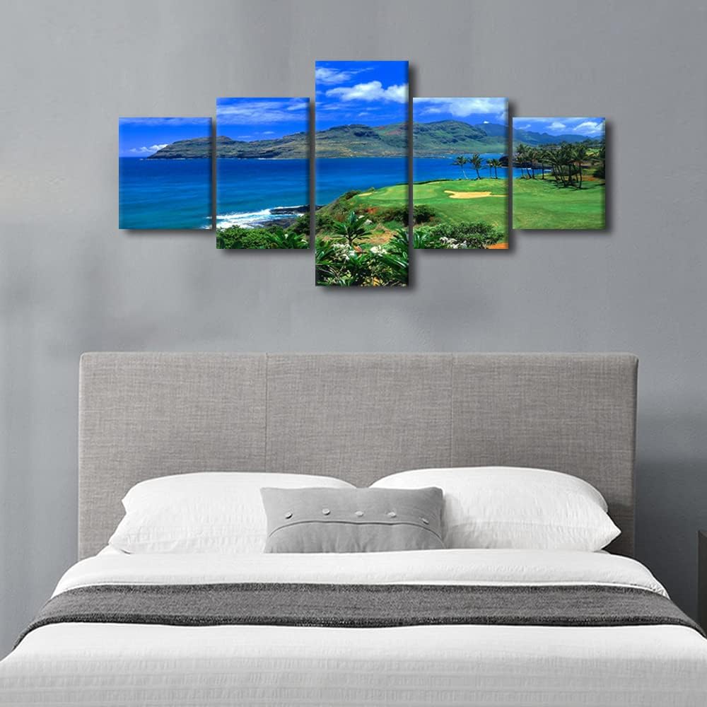 Lagoons Golf Course Wall Art Hawaii Ocean Golf Course Wall Decor Posters Framed Paintings Canvas 5 Panels Wall Art for Living Room Bedroom Office Wall Decorations Framed Ready to Hang - 50" W x 24" H