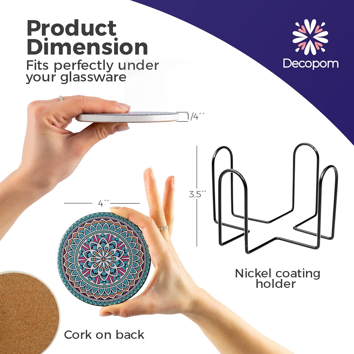 Mandala Drink Coasters with Holder - 8 Set Ceramic Boho Coaster for Drinks Absorbent with Cork Base and Black Holder - Coasters for Coffee Table Apartment Wooden Bar Mugs Glasses Cup Beer
