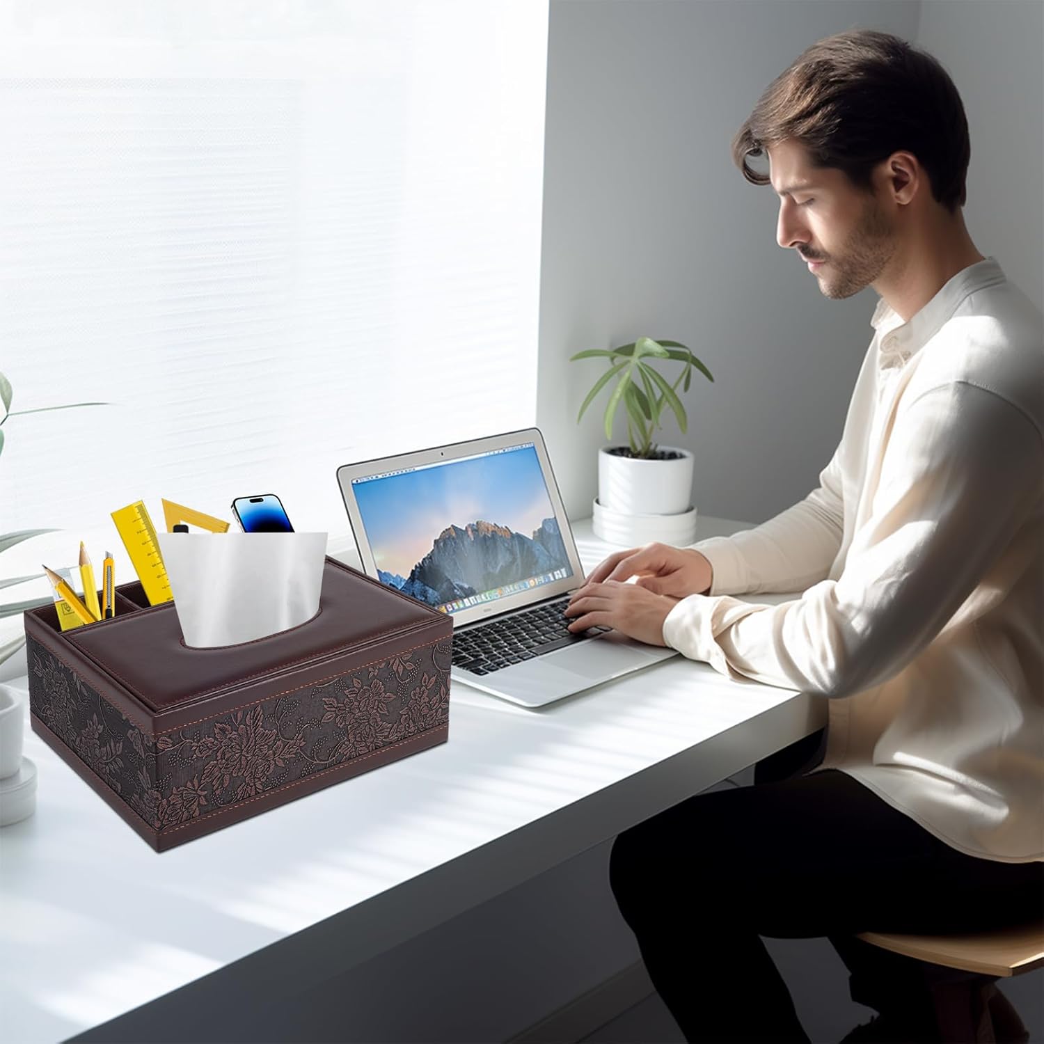 - 5- Tissue Case Includes - 3 compartment for scissors, remote control, mobile phone, lipstick, Stationery and keys. And a small covered storage room that is to storage tissue.A Multifunctional Desktop Organizer and Practical Napkin Holder for your office, house, living room, bedroom nightstand, countertop, bathroom and etc.