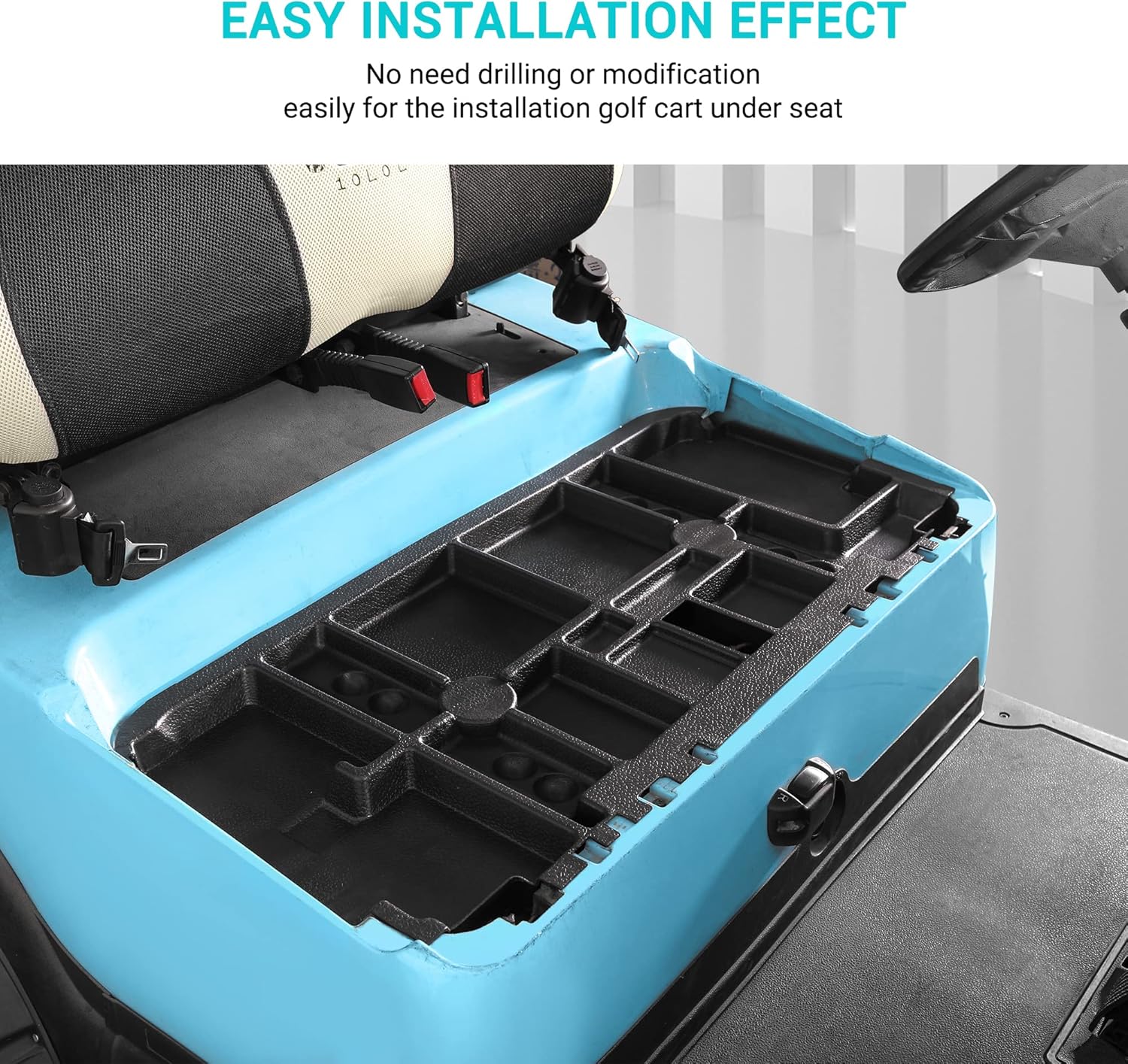 - Easy to Install and Clean: Designed for this model, this golf cart sits under the driver's seat cushion and is very easy to install. You simply pop out the seat and place the storage tray under the seat to complete the installation. Pop it out if necessary for easy cleaning and replacing the batteries.
