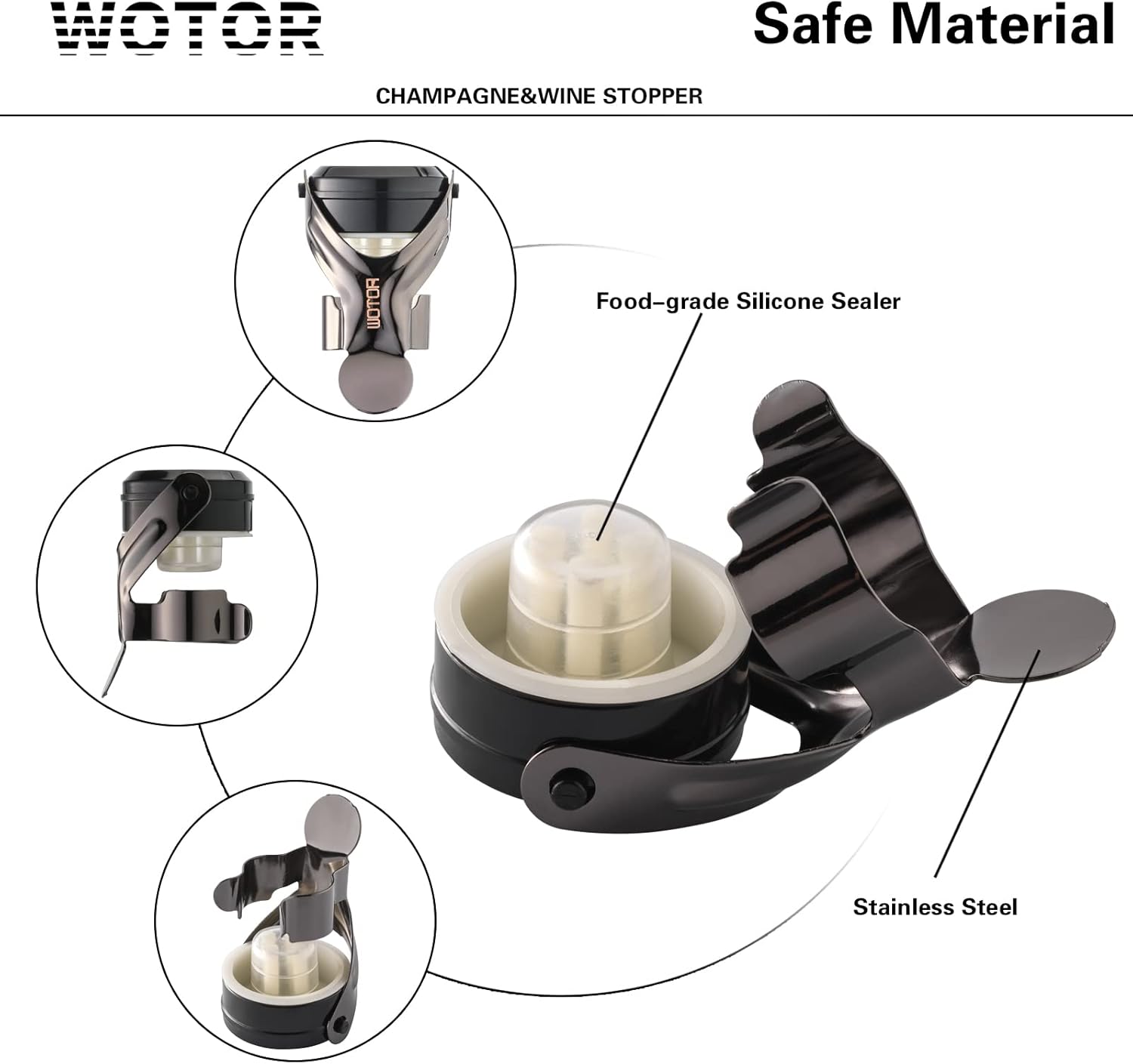 WOTOR Champagne&Wine Bottle Stoppers Stainless Steel with Food Grade Silicone, Leak Proof Keep Fresh Reusable Saver, Cork Suitable for Wine, Champagne, Cava, Prosecco and Sparkling (4 Pack Black)