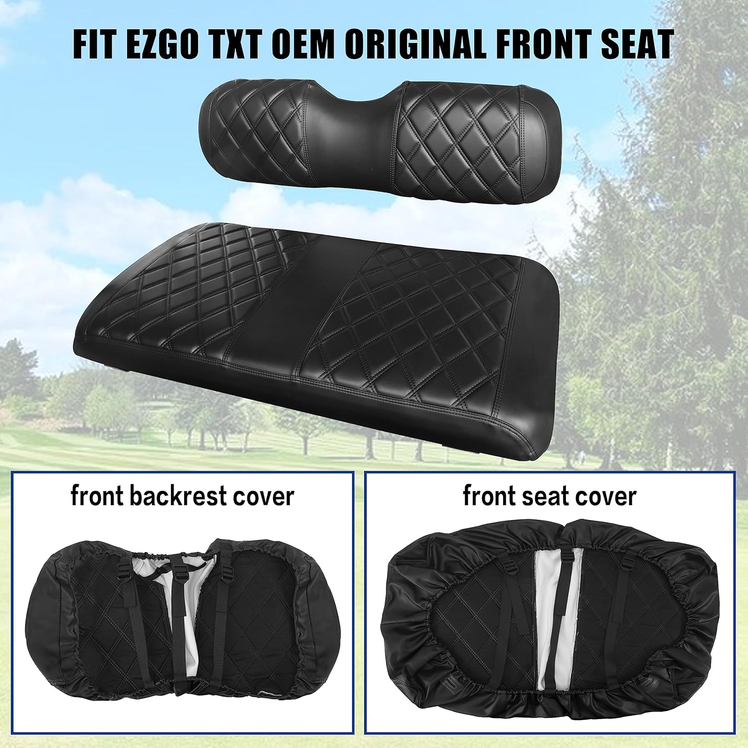 - ăApplicable scopeăGolf cart ET diamond front seat cover, this product contains 1 front backrest cover (about 36 X 10.55 X 4.5 inches) and 1 front seat cover (about 40.2 X 20.15X 4.5 inches), only for EZGO TXT1994-2013/EZGO RXV OEM Standard Front Seat Cushion , not for Premium thick seat cushion.