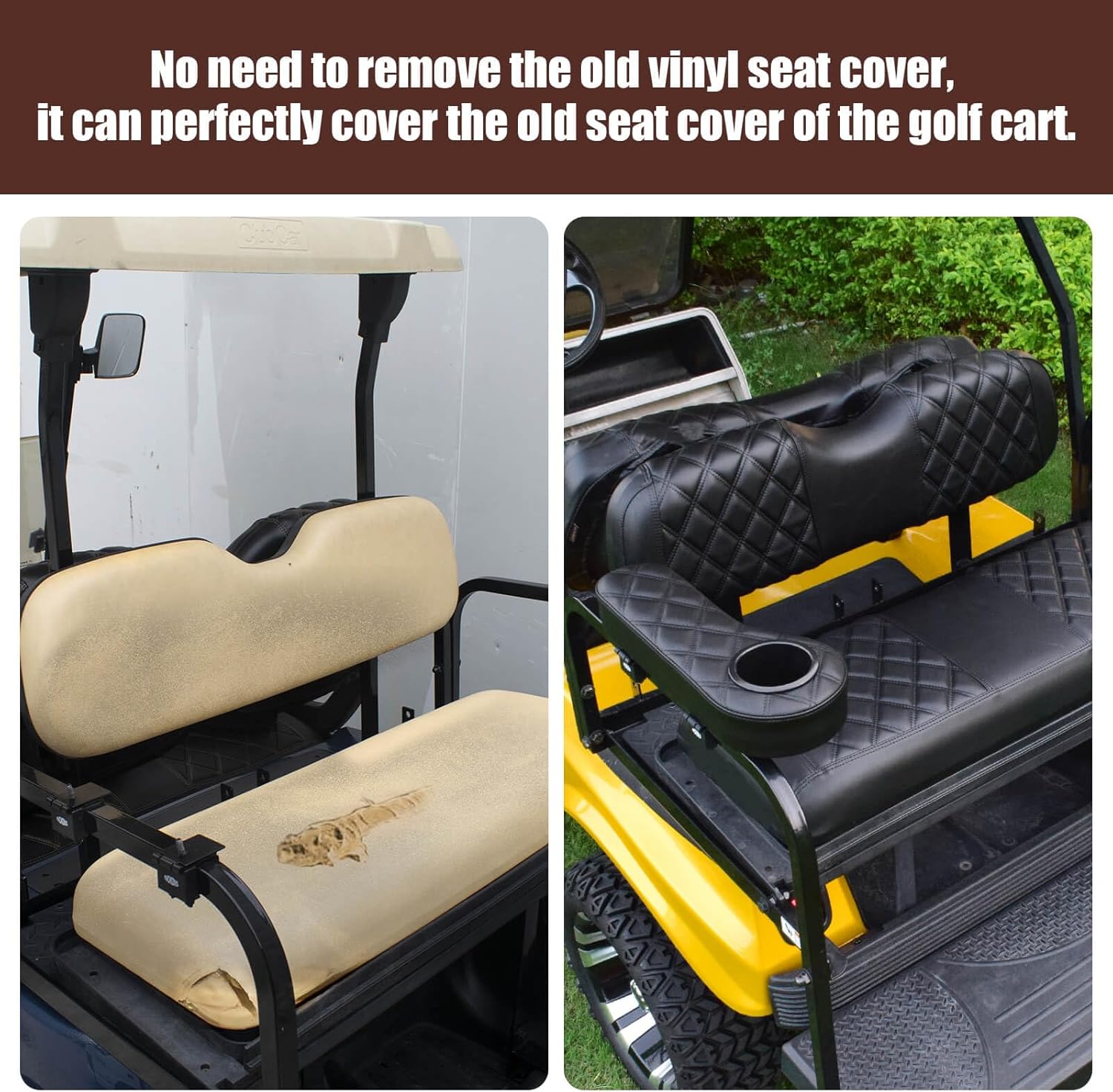 - ăEasy to installăThe club cart leather seat cover is a fully molded seat cover, no need to use gun nails and no need to remove the old vinyl seat cover, it can perfectly cover the old seat cover of the golf cart. In addition, the adjustable shoulder straps and retractable buckle design help to easily install and remove in minutes.